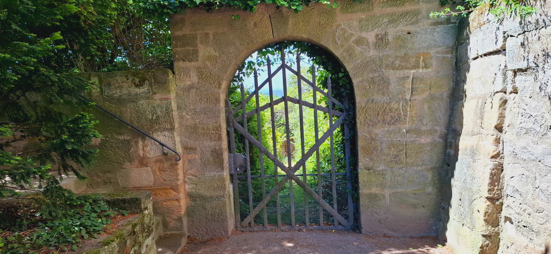 Цвингером называется пространство между двумя защитными стенами. Пройти в промежуток сейчас невозможно, через калитку видны деревья.