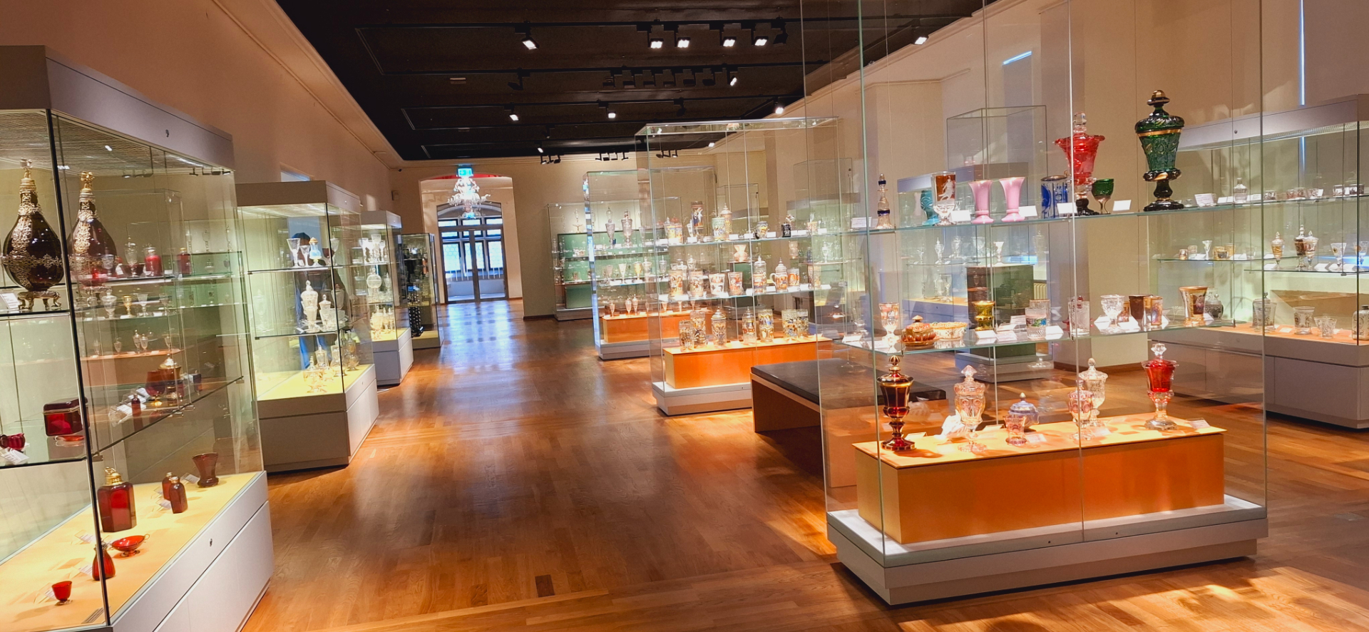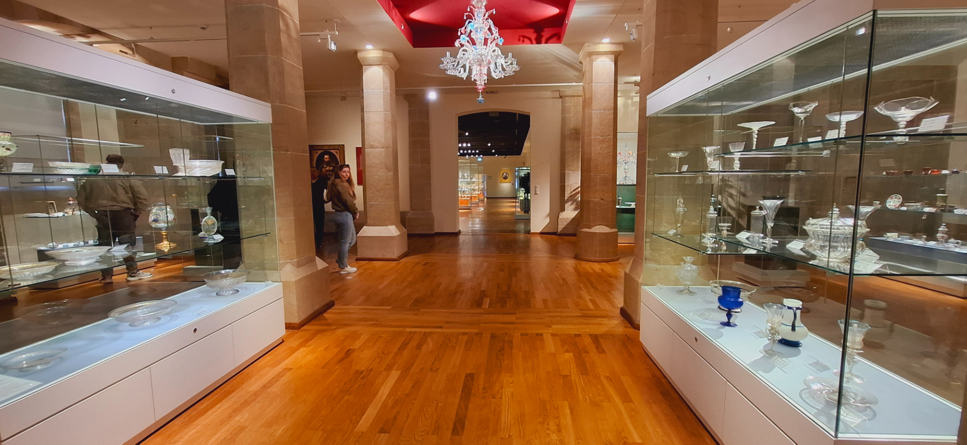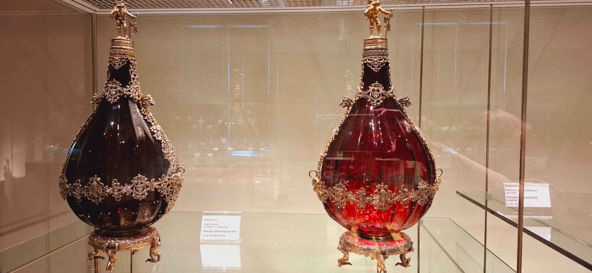 Из здания «с покоями», по лестницам спускаясь вверх/вниз, попадают в помещения с отделом стекла. От Бального зала с «охотничьей комнатой» дальше идет целая анфилада помещения с выставкой муранского и венецианского стекла. Витрина с изделиями муранских мастеров. Дальше стеклянные стеллажи с вычурной посудой. Мне две бутыли 17в. глянулись, кажется это рубиновое стекло. И без вина внутри, бока как бы переливаются, светятся изнутри.
