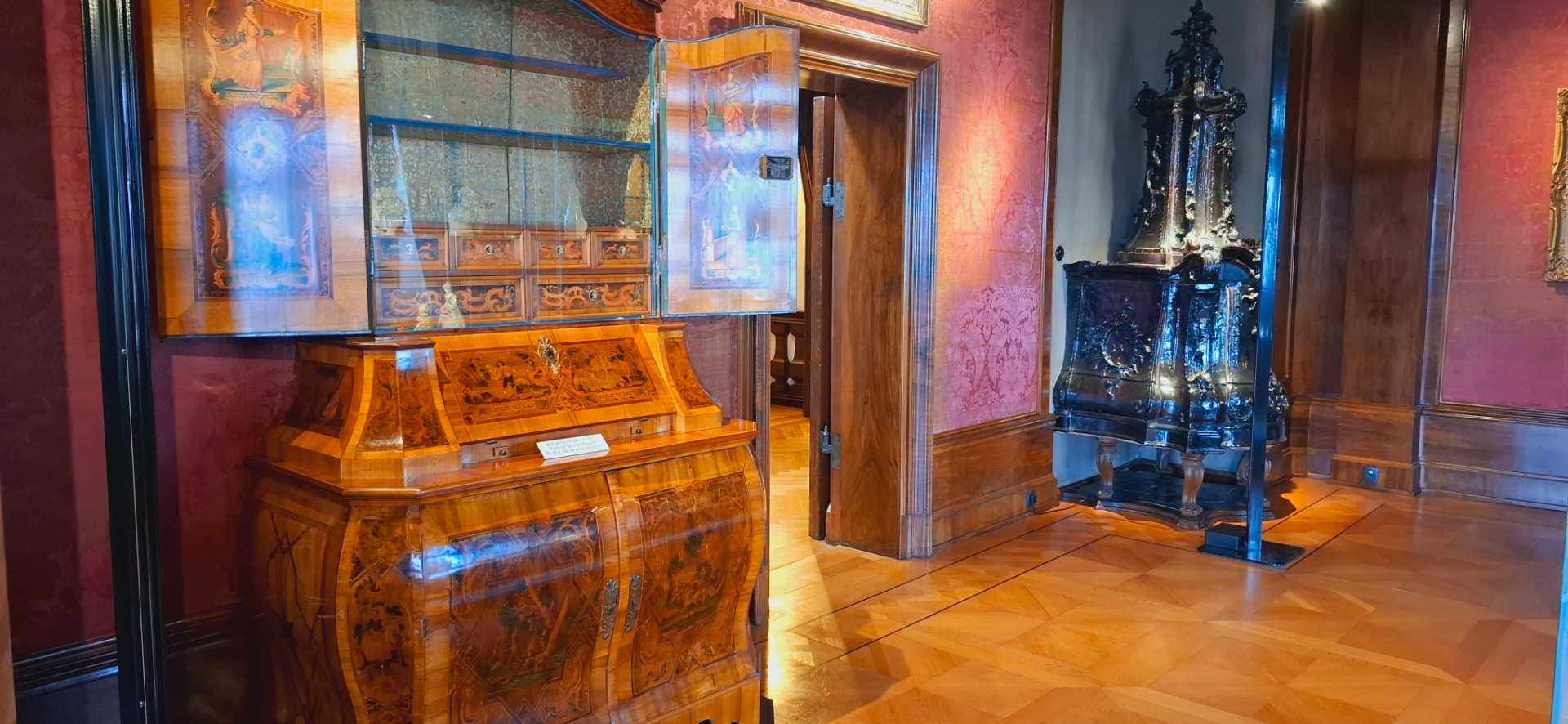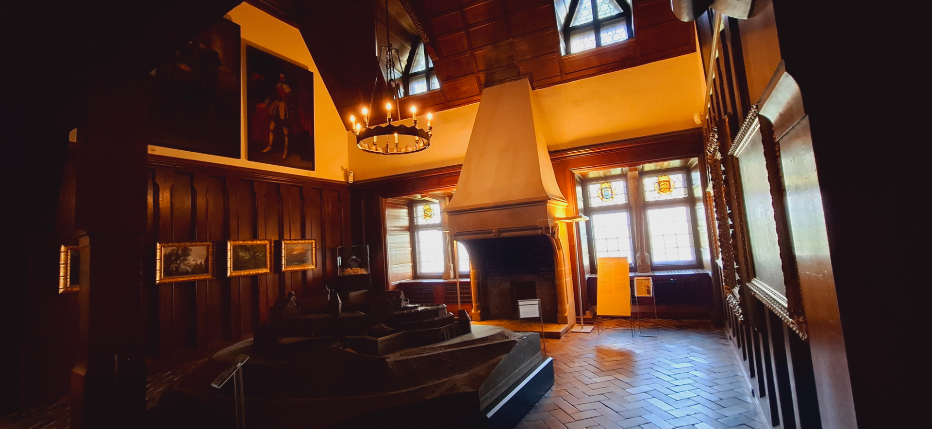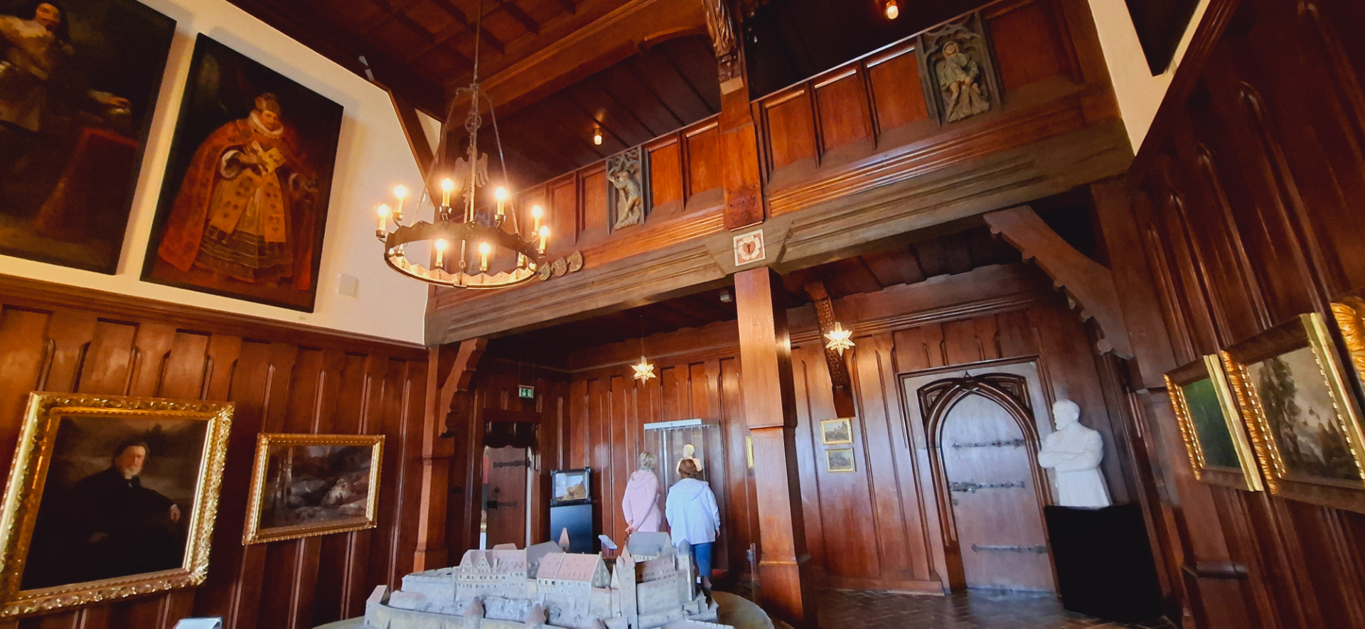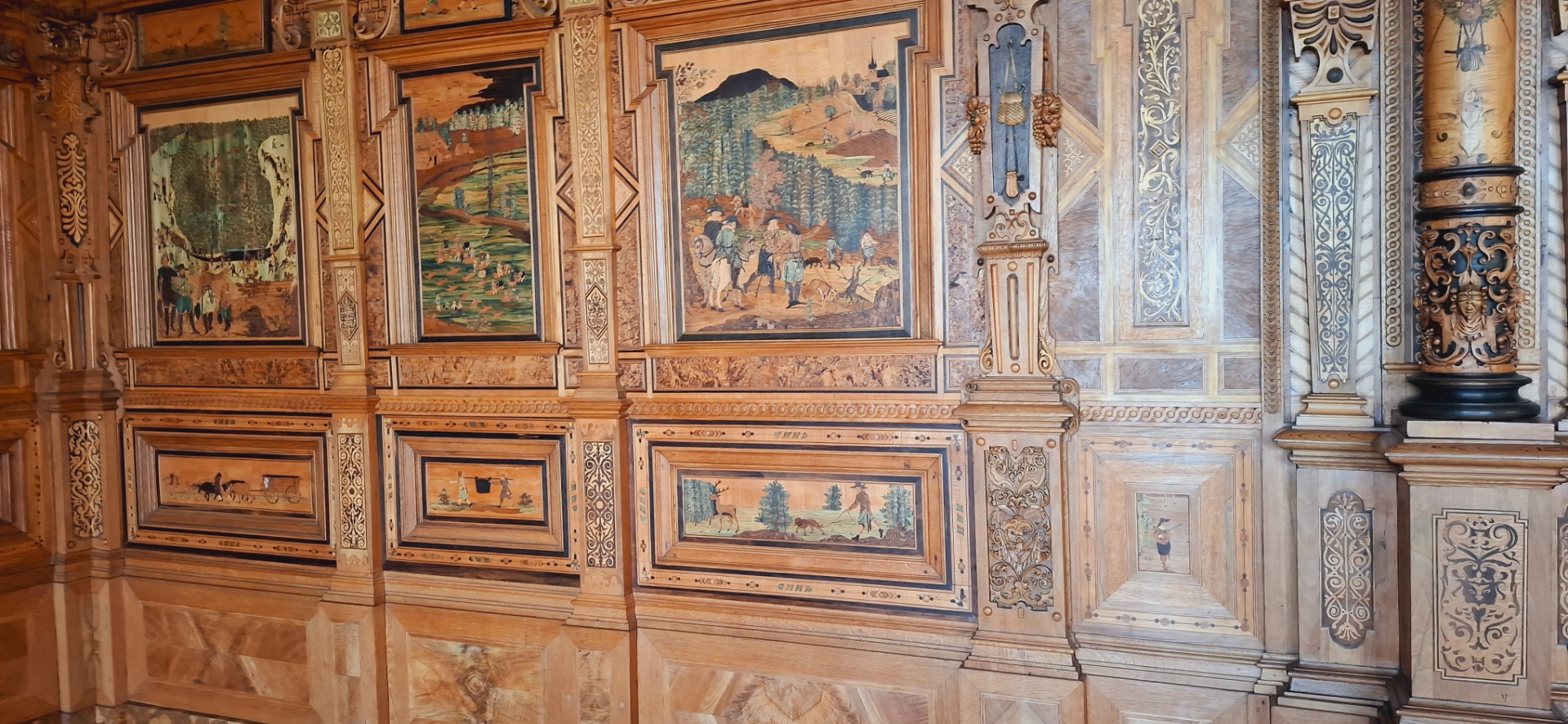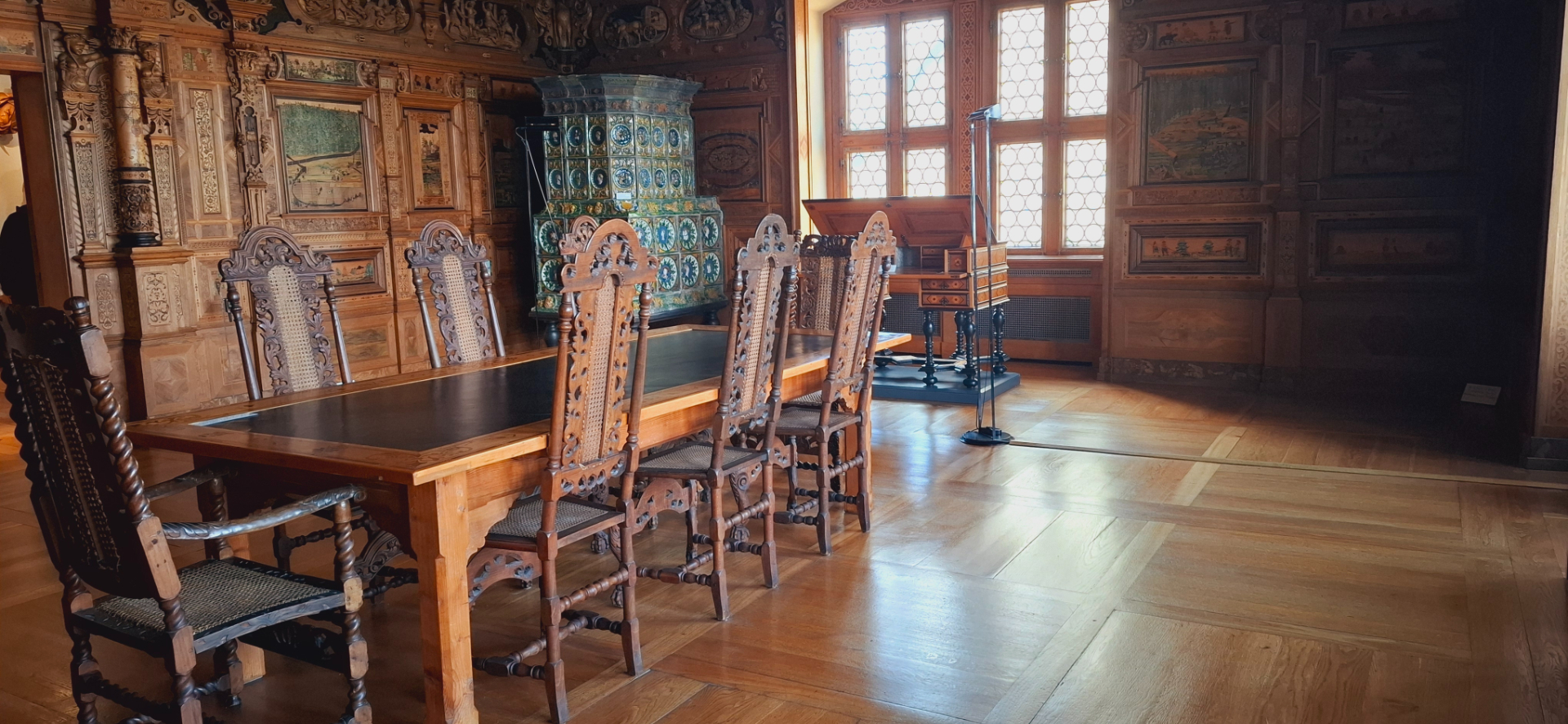 Вся комната окружена 60 панелями из дерева с инкрустацией, изображающими сцены охоты в совершенно разных форматах. Этот великолепный зал когда-то был частью «Эренбурга», городского замка в центре города герцогов Кобургских. Прочитав об этом при планировании поездки, в городской дворец и по этой причине не пошла. Его сильно «пощипали» ради музеев крепости, куда основной поток туристов едет.