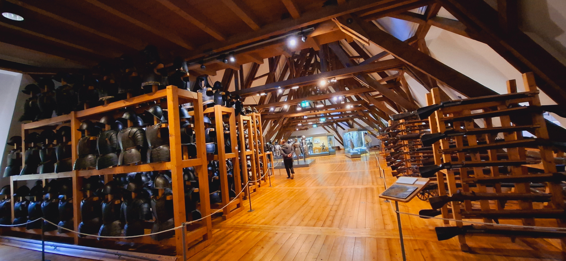 Спуск по лестнице в полу-подвал и натуральное подвальные помещения. В них находится самая тяжеловесная часть музея. Большая коллекция рыцарских доспехов, холодного и огнестрельного оружия. Многочисленные стеллажи уставлены деталями средневековой амуниции - шлемы, панцири, наколенники, налокотники, поножи, перчатки. Есть даже две детские кирасы, они реально принадлежали сыновьям полковника Конитца, который командовал гарнизоном крепости в начале XVIII в.