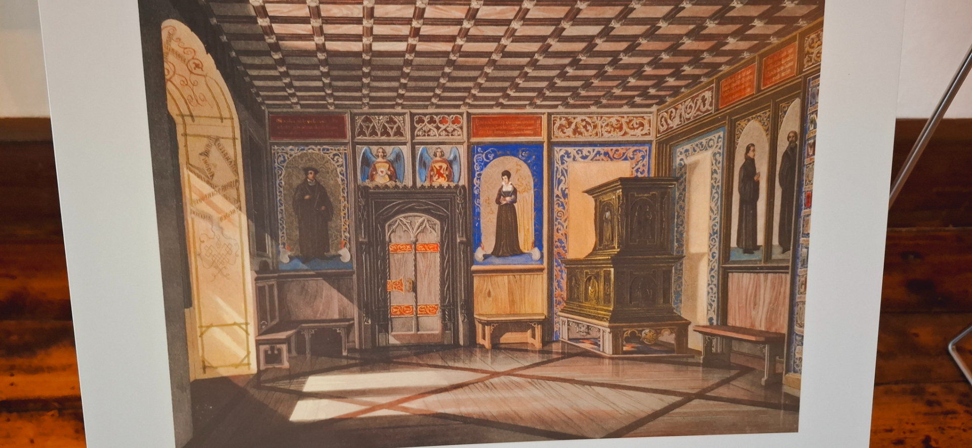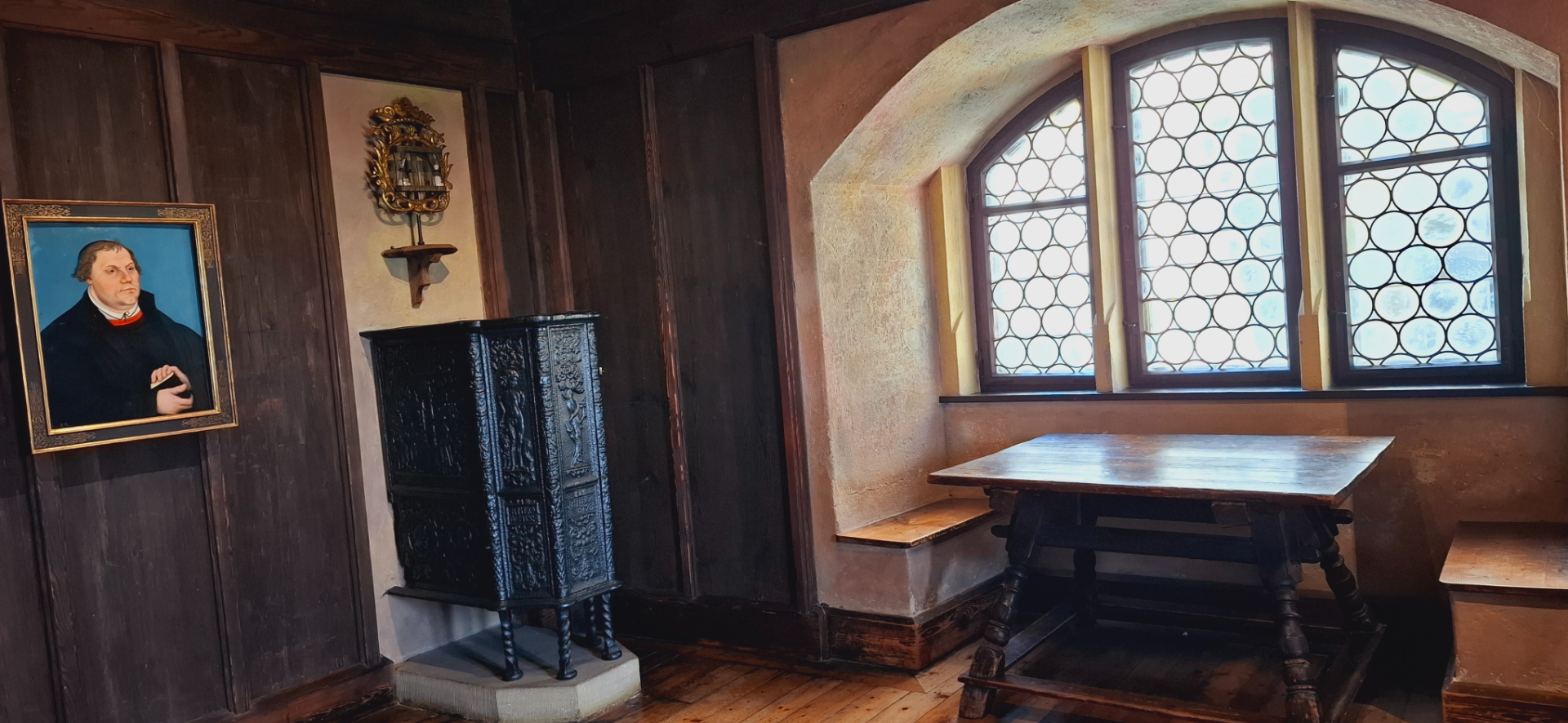 Лютер занимал, я бы сказала, большие смежные комнаты. По сравнению с его комнаткой в Ватрбурге, достаточно уютные и комфортабельные. Но надо помнить, что это здание в крепости Кобург - построенное заново, в Вартбурге - старинное. На стене изображение, как выглядела комната раньше.