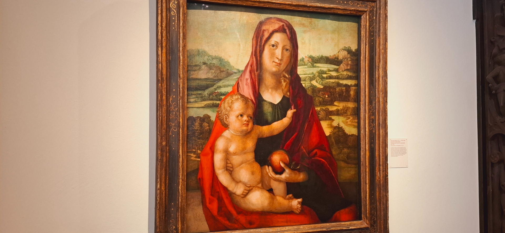 Альбрехт Дюрер. Мадонна с младенцем на фоне пейзажа. 1495 год. Этот сюжет был очень популярен в итальянской живописи, например у Якопо Беллини, которого Дюрер очень ценил. Возможно, Дюрер написал картину во время своего первого путешествия в Италию.