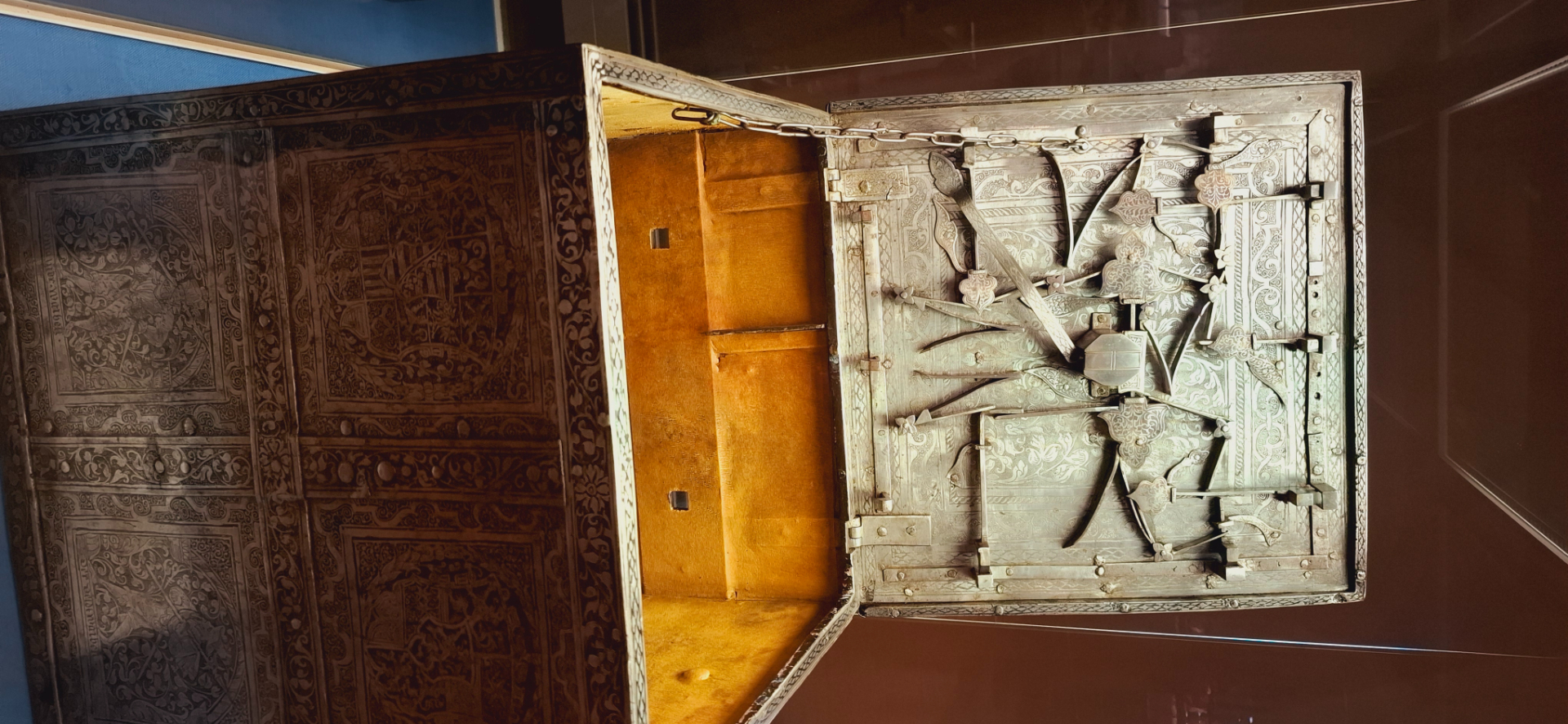 Между стеллажами с оружием стоит небольшой старинный сейф с секретным замком. Главное в нем – сложная система запора в крышке. Занимает всю площадь верхней крышки и при поворачивании ключа, механизм совершает несколько действий. Странно, что нет замков для нижней части.