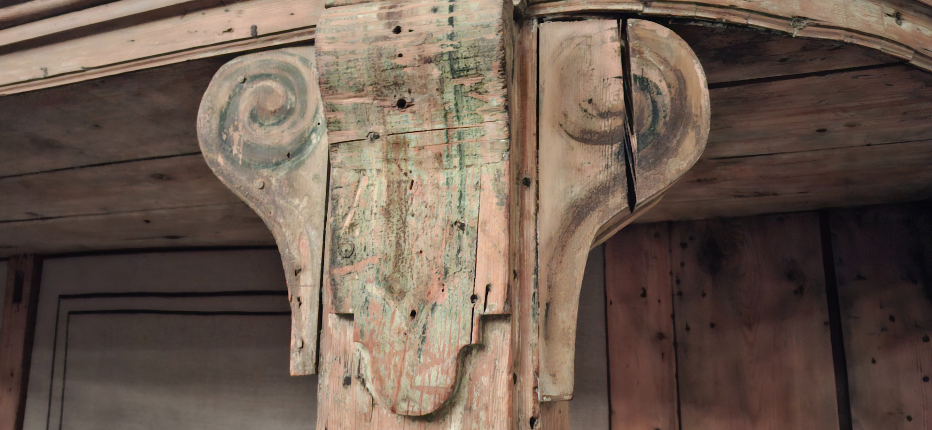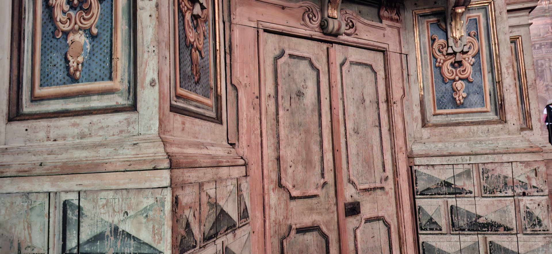 Стены, в основном деревянные, как и балясины на лестницах, раскрашенные под камень.