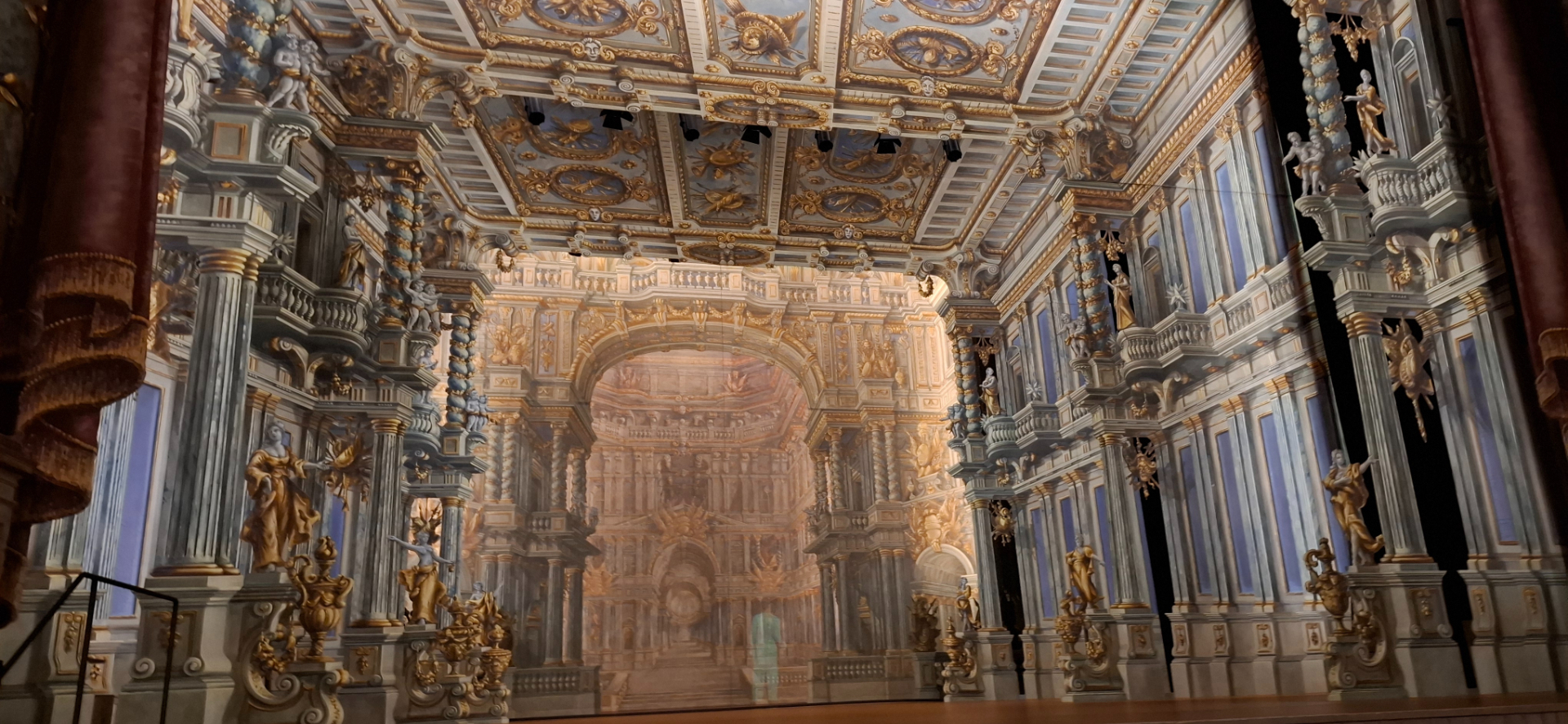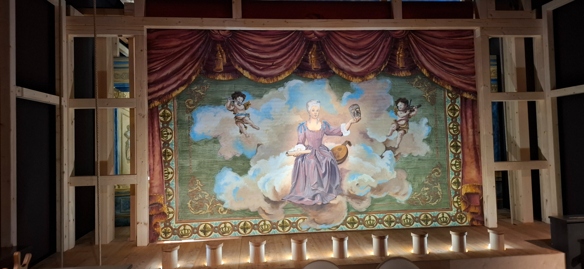 Приглядитесь и увидите, что галереи, стены, ДАЖЕ сценичный занавес «не настоящие». Занавес, скорее всего картон.