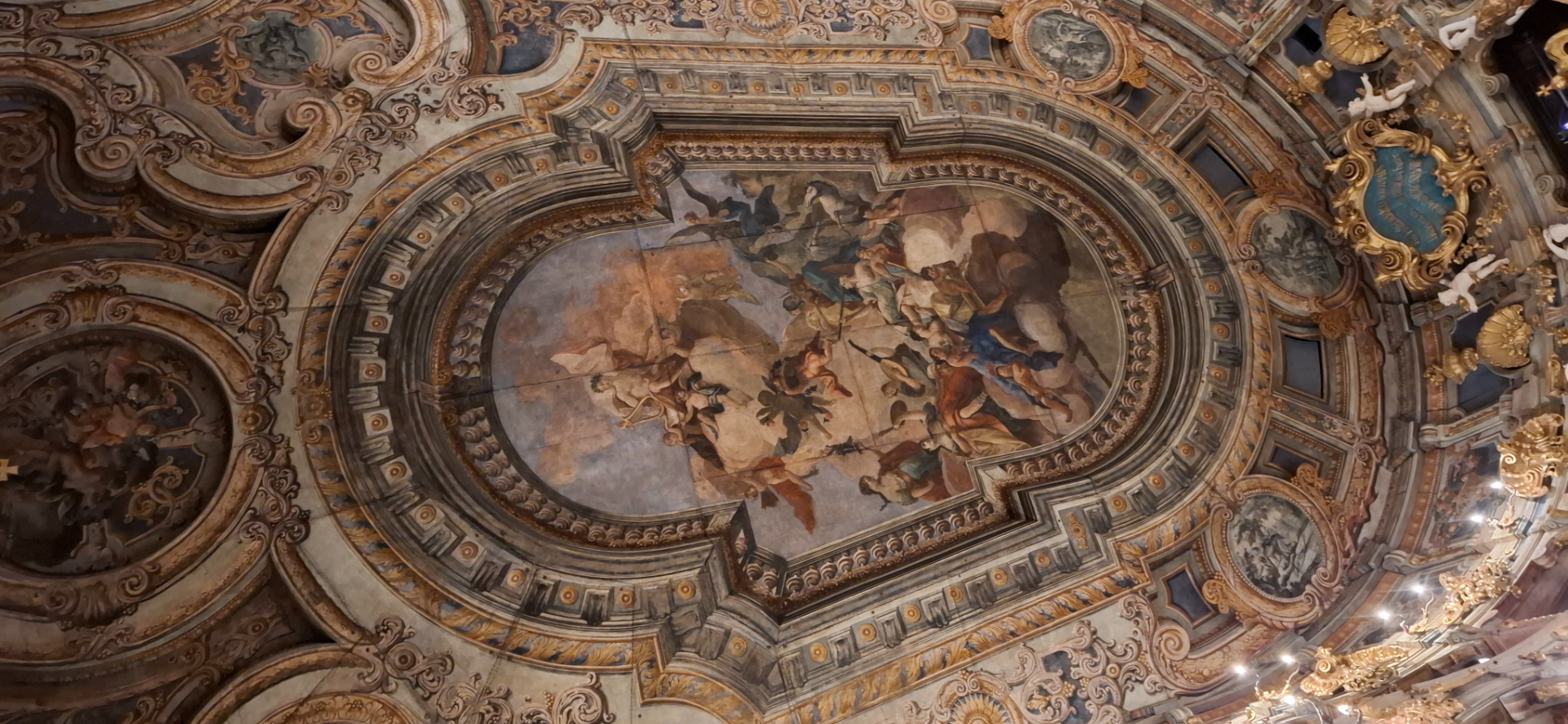 Раз нет люстры, надо рассмотреть сам потолок. Точнее, изображение на нем. Потолок резной, по центру него размещена большая фреска с изображением Аполлона и девяти муз, по краям находятся медальоны со сценами из «Метаморфоз» Овидия.
