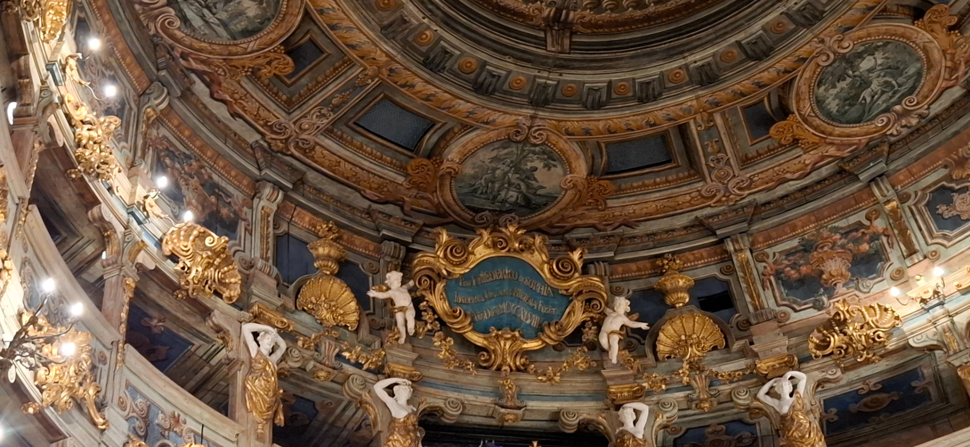 В зрительном зале нет центральной люстры, так как при строительстве здания в первую очередь была роскошь интерьера. И свет в то время был возможет только от свечей, что полностью в картонно-деревянном помещении могло быть чревато. Внутри получают сказочное удовольствие от созерцания великолепия со всех сторон, даже без люстры😊.