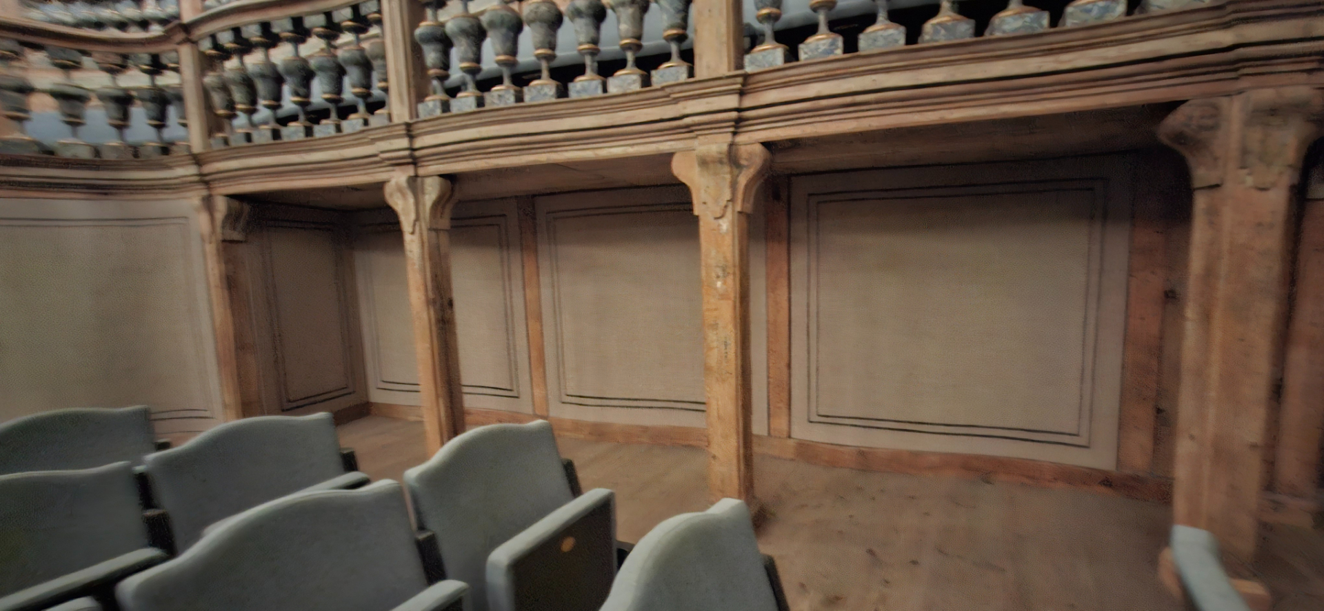 Не очень соответствуют интерьеру современные кресла в зрительном зале. Так в старину вообще были жёсткие деревянные стулья без подлокотников, а в антрактах зрители выходили на улицу, в парк.