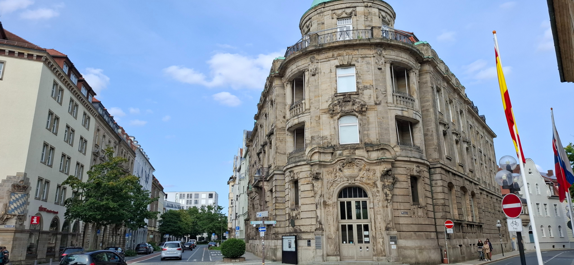 Если смотреть от канала, то влево на Opernstr., виднеется краешек какого-то углового здания. Это краешек, чего надо краешек😊. В здании находится знаменитый на весь мир театр, где расположен Байройтский оперный театр. О нем написала отдельный отзыв, настолько он поразил внутри. Снаружи-то здание скорее на административное похоже. Даже колонны с балконом не дают понять, что внутри театр.