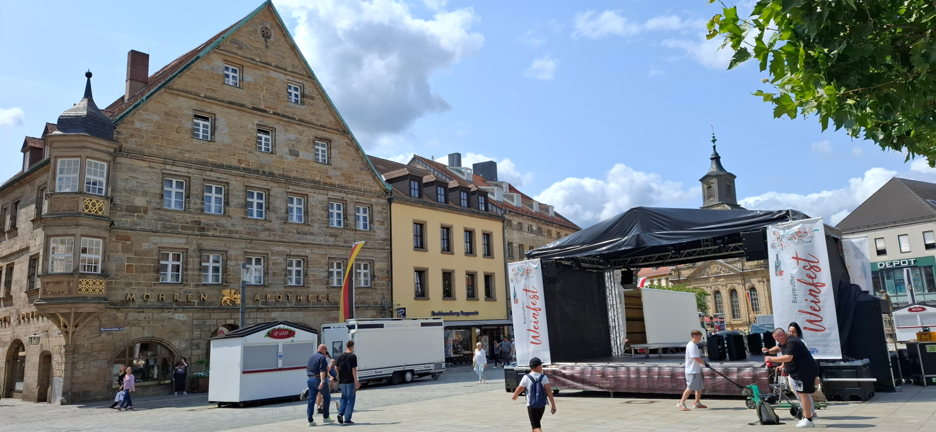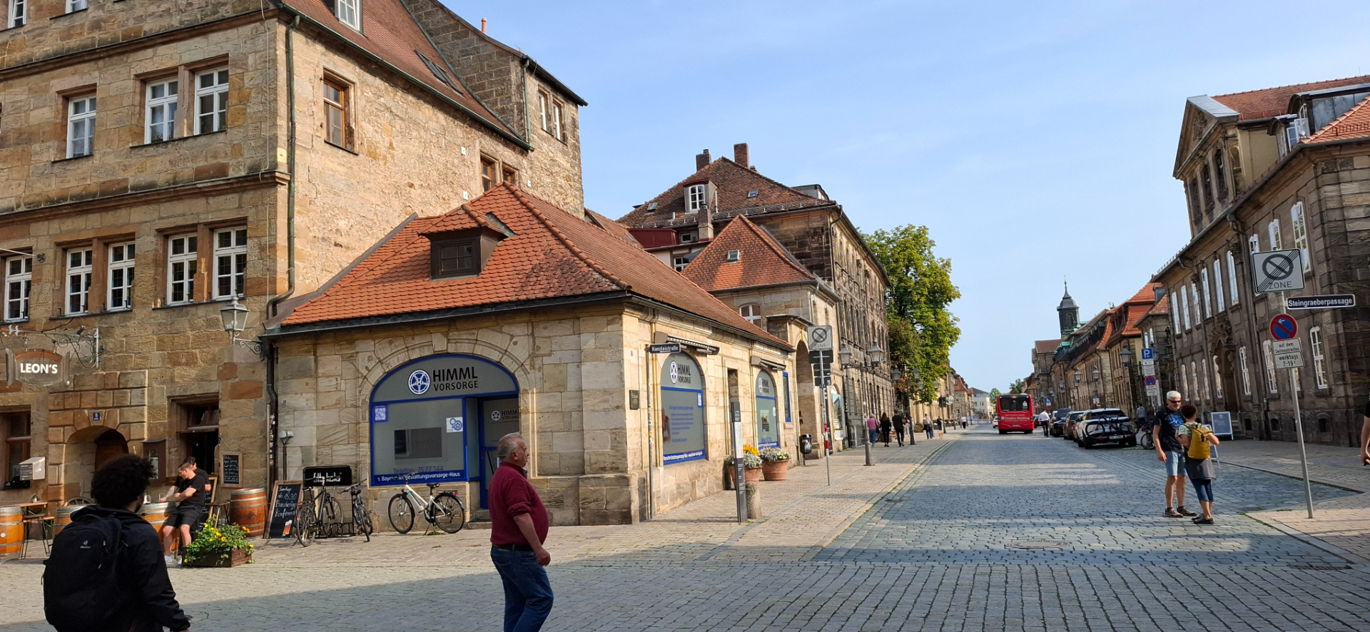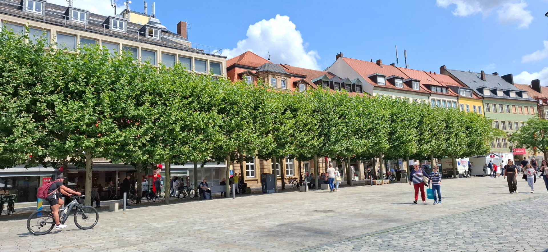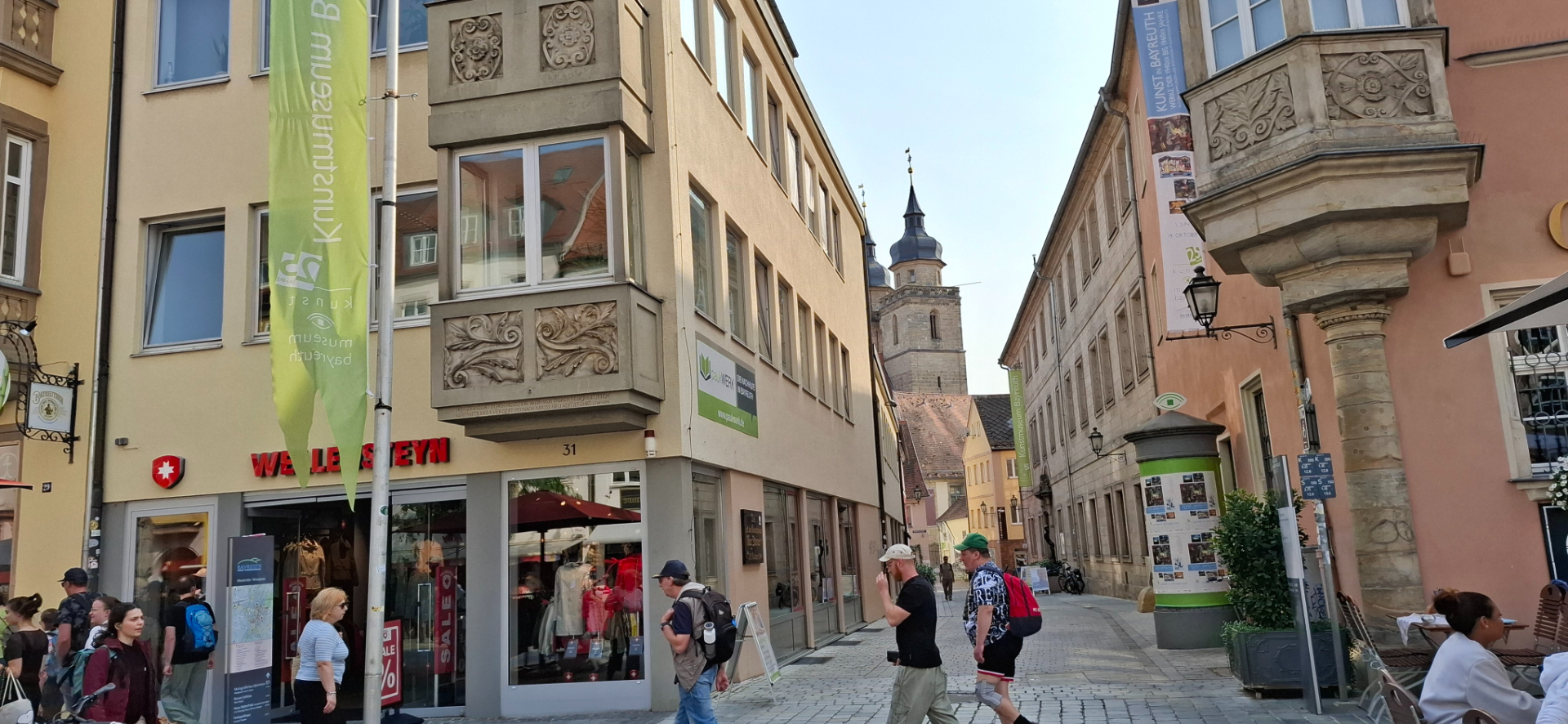 Здания вдоль улицы в историческом центре (Maximilianstraße / Brautgasse и прилегающие улицы, часть старой застройки старого города Bayreuth. Сейчас эта улица, и кварталы рядом, являются пешеходной / торговой зоной, с магазинами, кафе, музеями и историческими зданиями.
