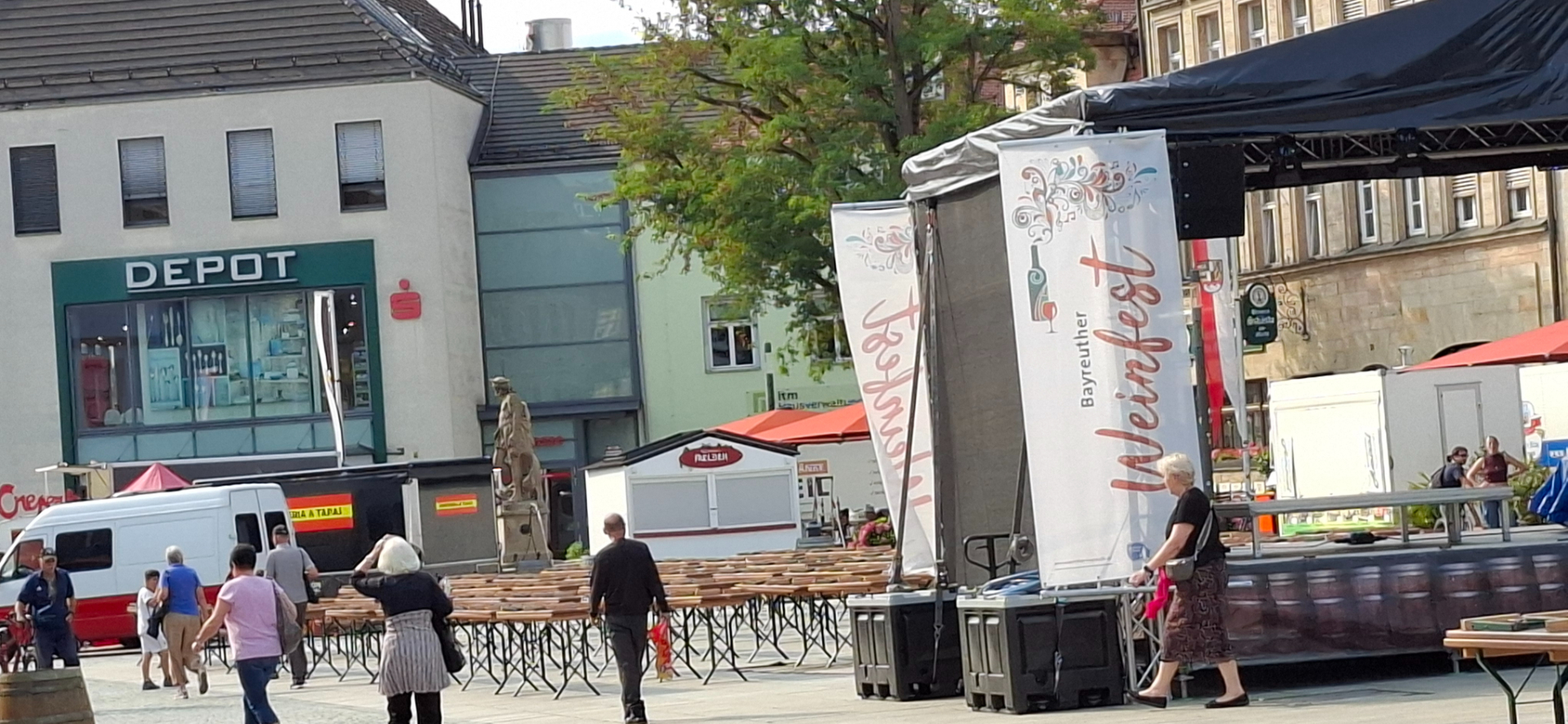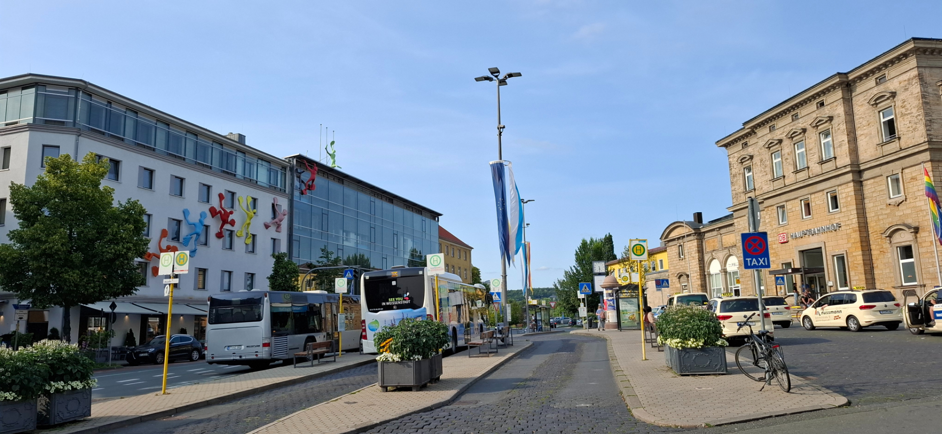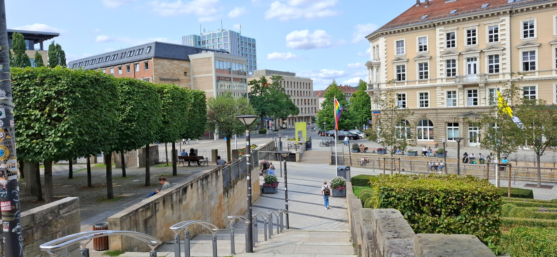 Конечно, это уже декорации, так как город подвергся массированным бомбардировкам 5, 8 и 11 апреля 1945 года, в результате чего многие ценные архитектурные памятники были полностью уничтожены. Пожар, разгоревшийся во дворце Райценштайн вследствие бомбёжки, перебросился на соседние дома, и вскоре пылал весь исторический центр Байройта. Но построенные заново «декорации» все равно впечатляют. Неожиданно было в столь небольшом городке увидеть имперскую роскошь. Сначала от подножия холма пошла вдоль него вправо. И пришла к автостанции с крытым павильоном ожидания на площади перед ней. От автостанции по улочкам слева, справа есть проходы наверх. И в самом здании лифт поднимает на переход к верхним частям города.