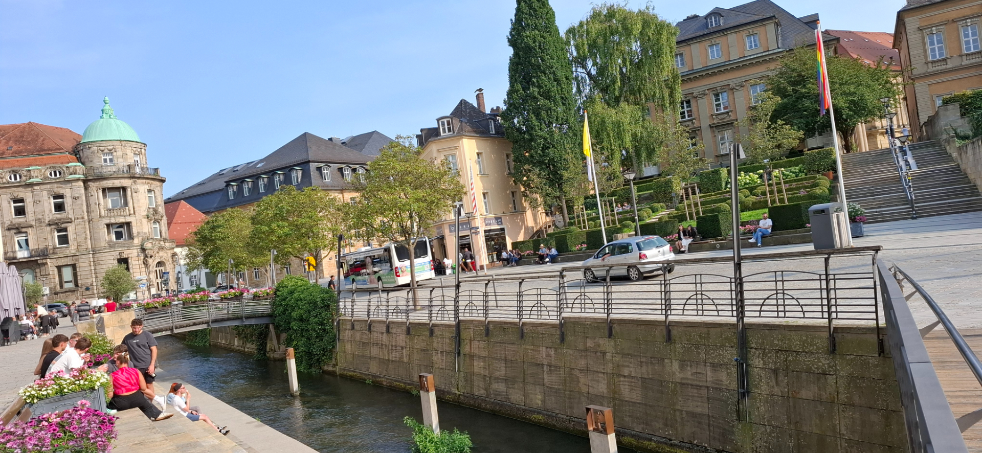 От Марктплац можно «поверху» дойти до Старого дворца, а можно и понизу от жд вокзала. При подходе в холму со «старым городом наверху», понизу слева свои достопримечательности. Через весь город текут речка Ротер-Майн («Красный Майн») и ручей. Есть и «Большой канал». – старый мельничный канал, но теперь в камне и ажурных ограждениях текущий. На открытие каждого летнего сезона по нему проезжает настоящая венецианская гондола.