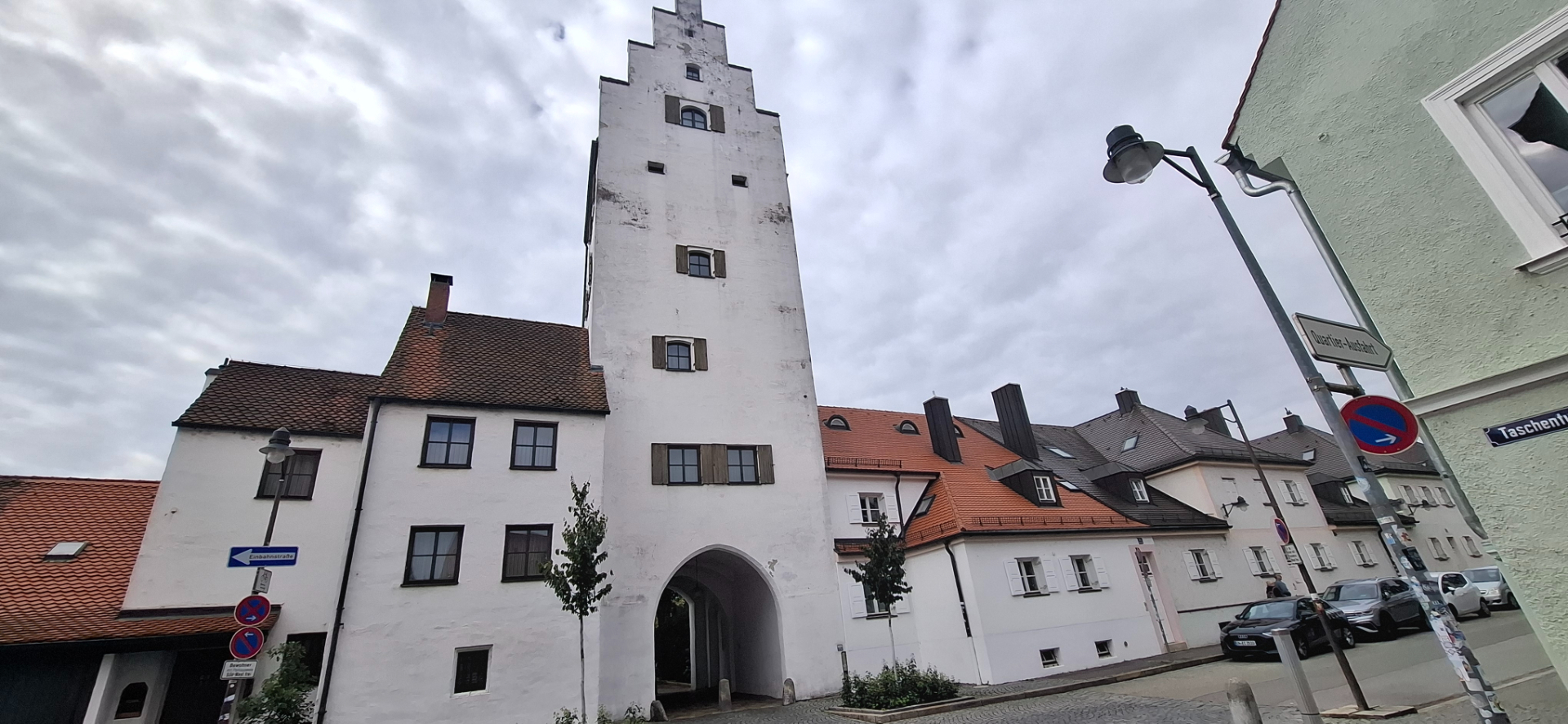 Средневековую башню Ташентурм надо искать. Вроде, по описаниям она высокая м ее должно видно где-то над домами. Но без подсказки местных жителей сама бы ее не нашла.Белоснежная башня с проходом-воротами на другую сторону. Название башни, скорее всего, от того, что ее двускатная крыша покрыта черепицей-Dachtaschen: в Средневековье использовалась в качестве жилища палача и городской тюрьмы. Во время охоты на ведьм в конце XVI века в башне проходили пытки подозреваемых в ереси. На некоторых из них лично присутствовал будущий курфюрст Баварии Максимилиан I, который жаловался своему отцу, герцогу Вильгельму V, на чересчур мягкие методы допроса ведьм в Ингольштадте!