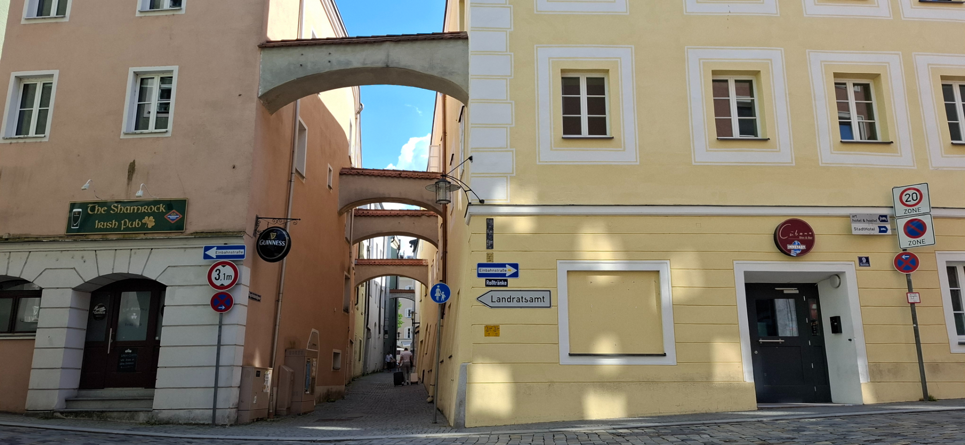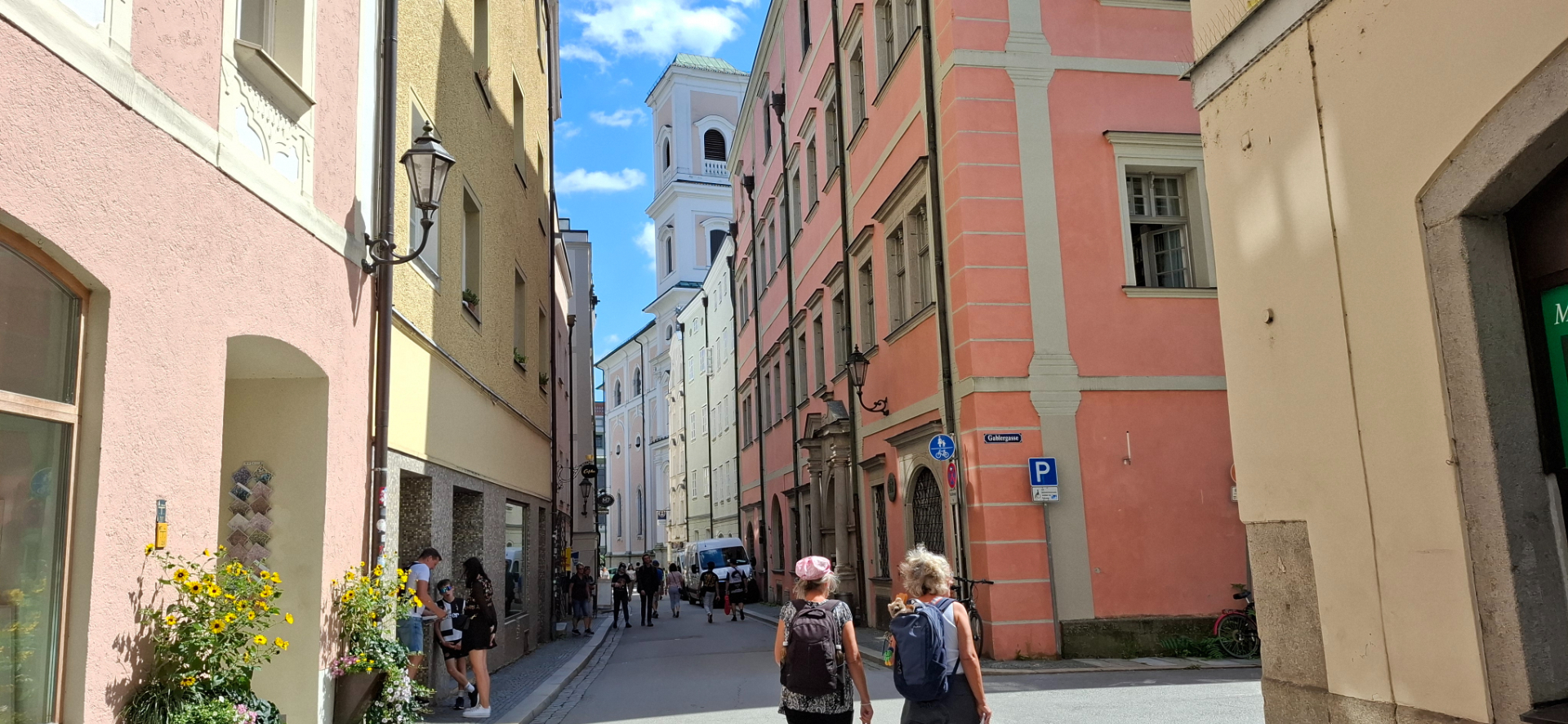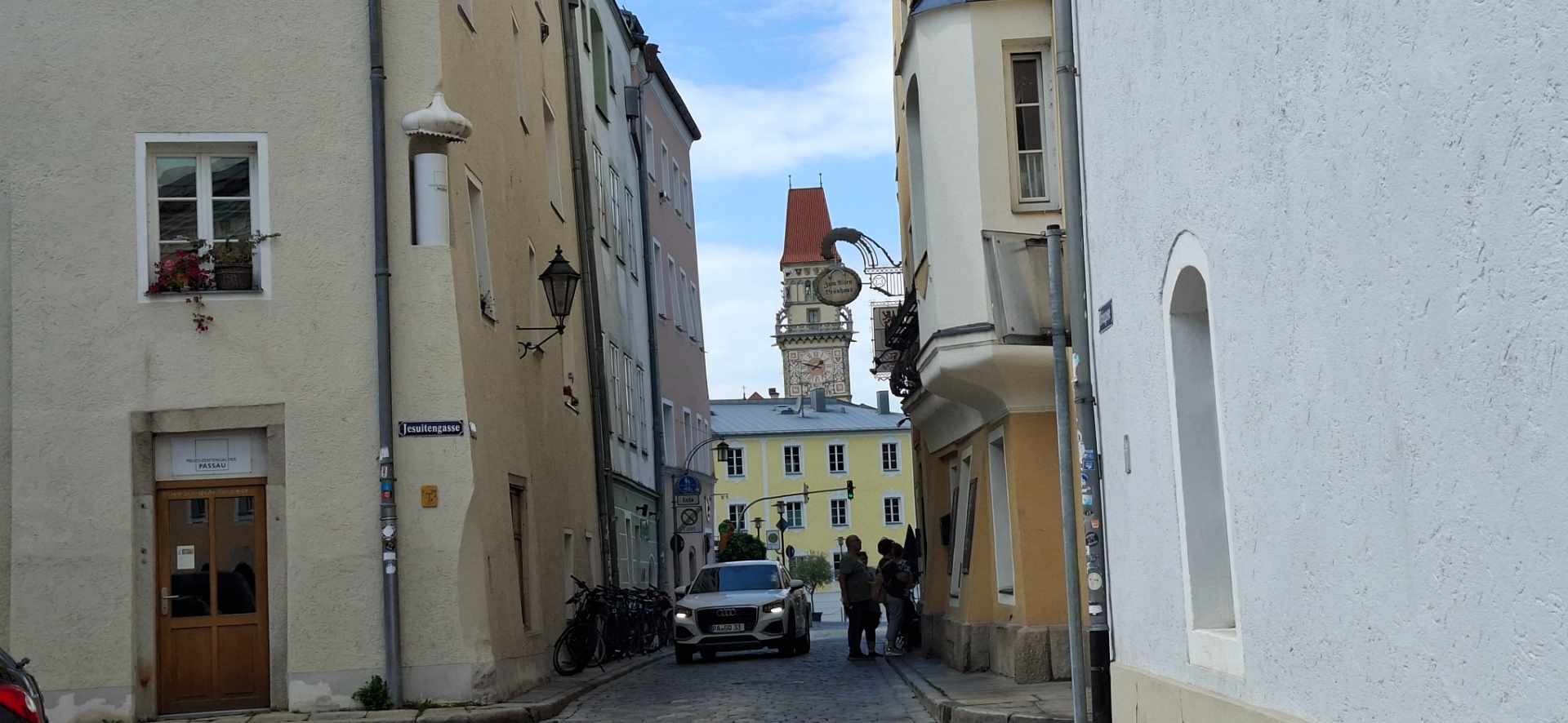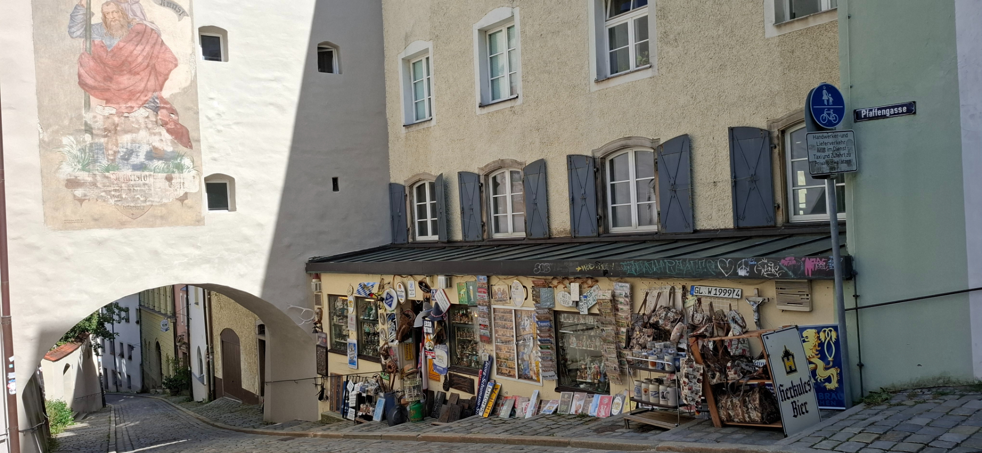В прежние времена Пассау был поделен на три части. Одна епископская - часть города возле Собора, другая гражданская - площадь за Собором, Ратуша, берег Дуная. Была и третья отдельная часть – территория монастыря Нидернбург. От соборной площади, как и все туристы, дальше и дальше по Альтштадту, теперь ощутимо вниз. От Собора центральная улица становится опять узенькой.
