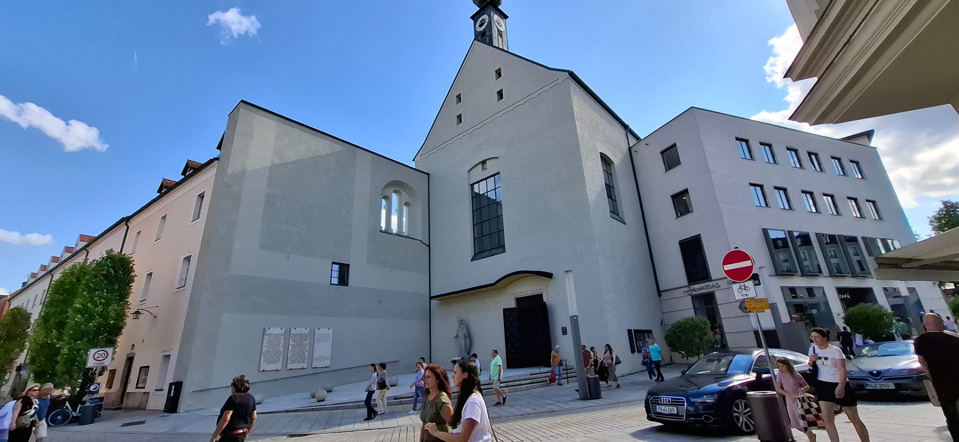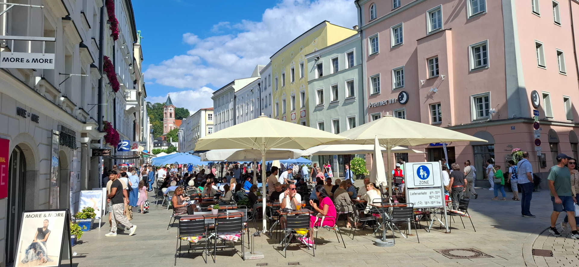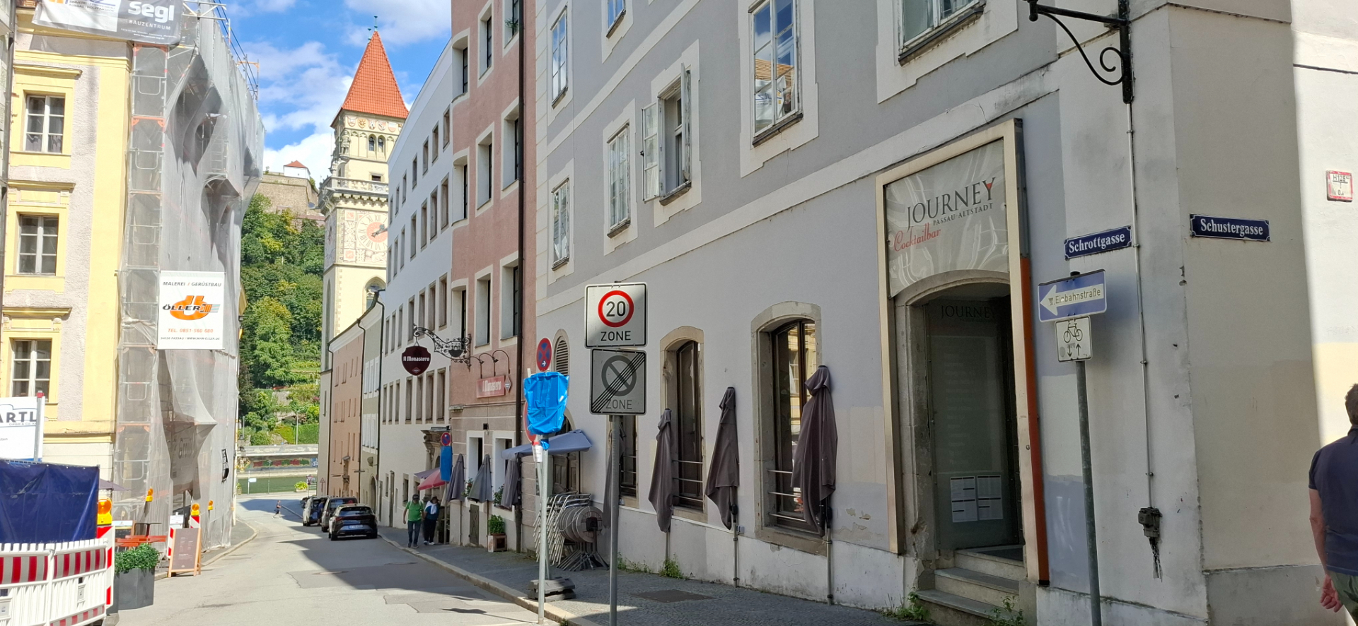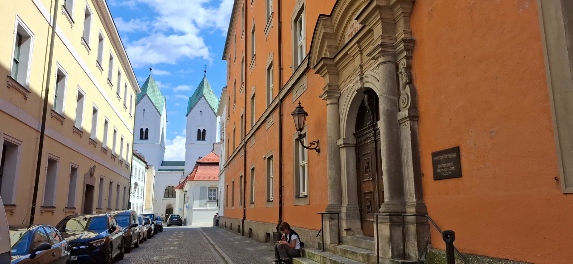 В прежние времена Пассау был поделен на три части. Одна епископская - часть города возле Собора, другая гражданская - площадь за Собором, Ратуша, берег Дуная. Была и третья отдельная часть – территория монастыря Нидернбург. От соборной площади, как и все туристы, дальше и дальше по Альтштадту, теперь ощутимо вниз. От Собора центральная улица становится опять узенькой.