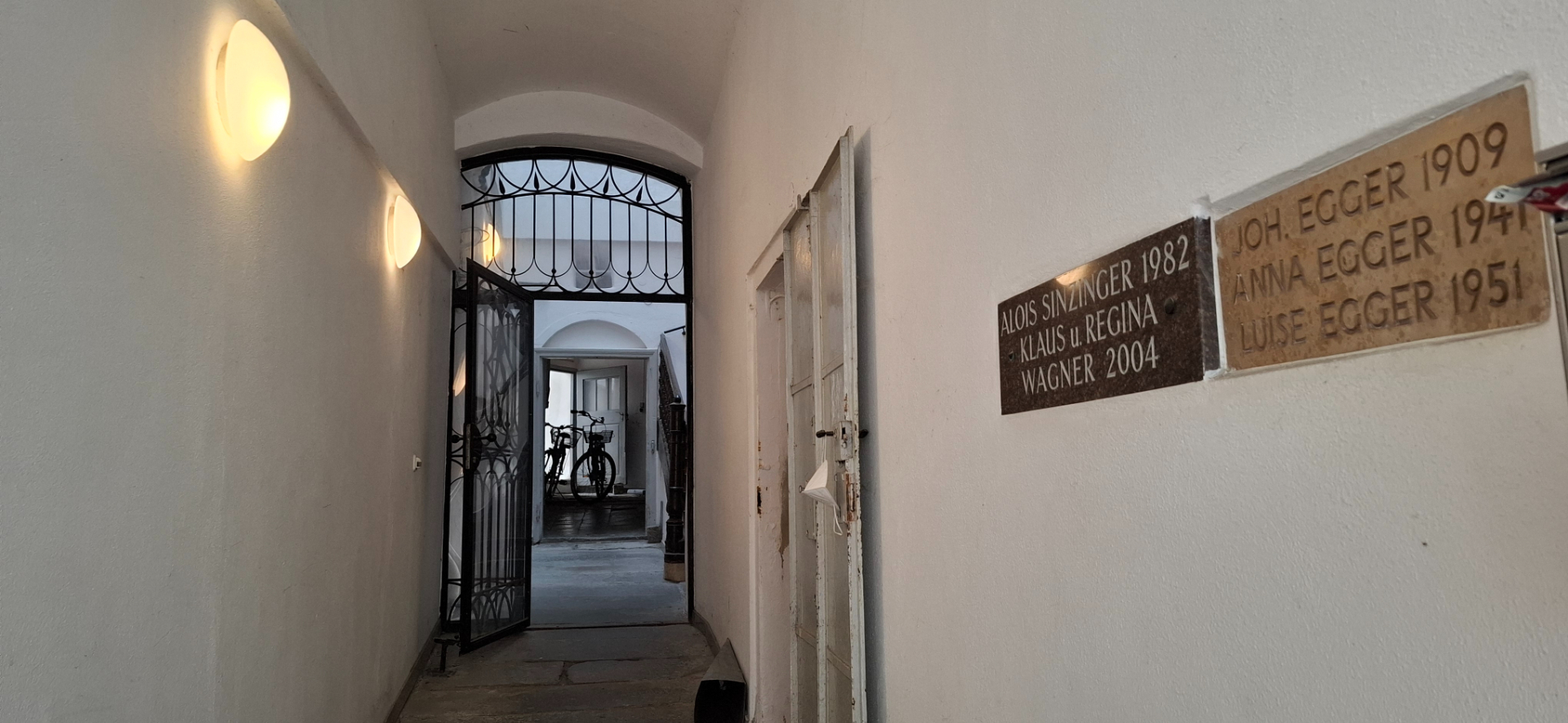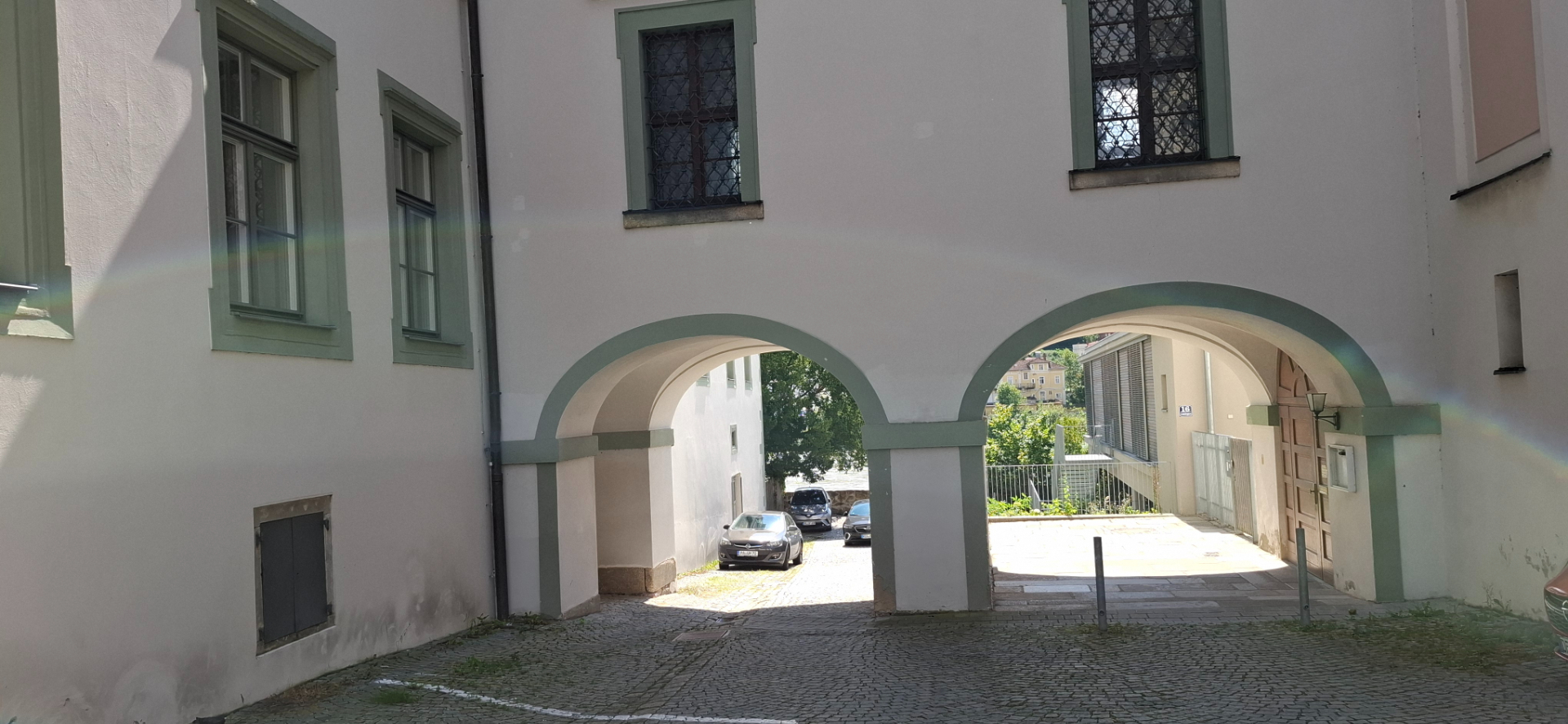 Но справа где-то за домами течет Инн, как к нему добраться? Выйдя на широкой пространство перед лицеем, решили сбегать направо (все налево норовят, мне вправо приспичило). Однако, прохода к реке тут нет. «Но мы не привыкли отступать», мне даже интересно стало, можно ли где от центральной улицы сразу на берег Инн выйти? Первый проход и широкий – за храмом находится.