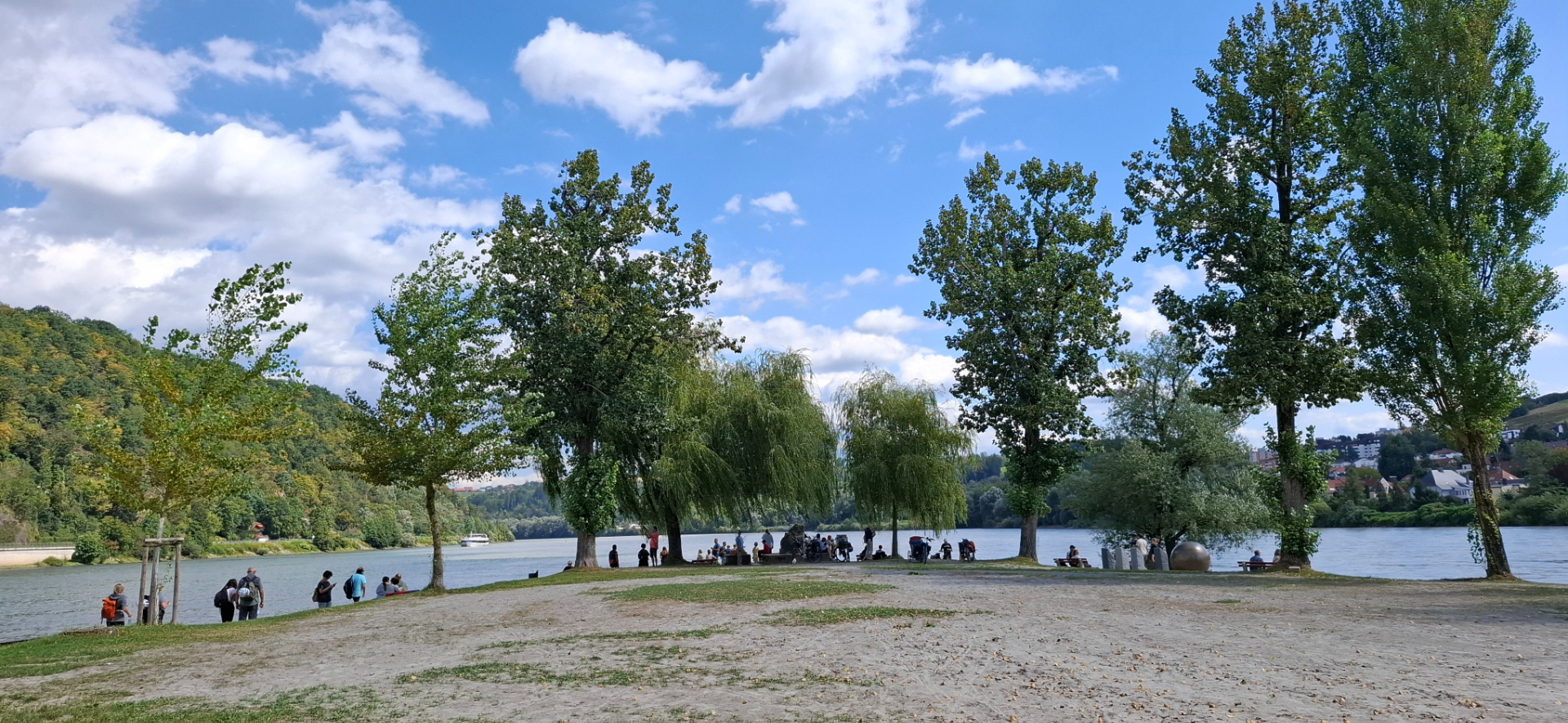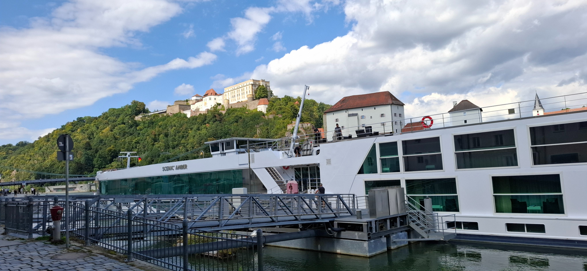 При подходе к кончику мыса есть пристань, где пришвартовываются круизные корабли. Очень востребованы путешествия на речных судах, которые предлагают различные маршруты по Дунаю. Вот и сейчас один из них, как плавучий отель, пристроился к берегу.