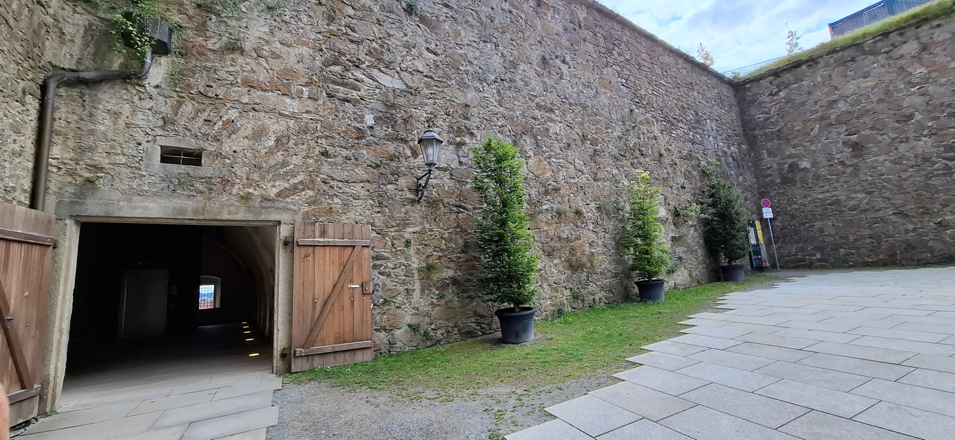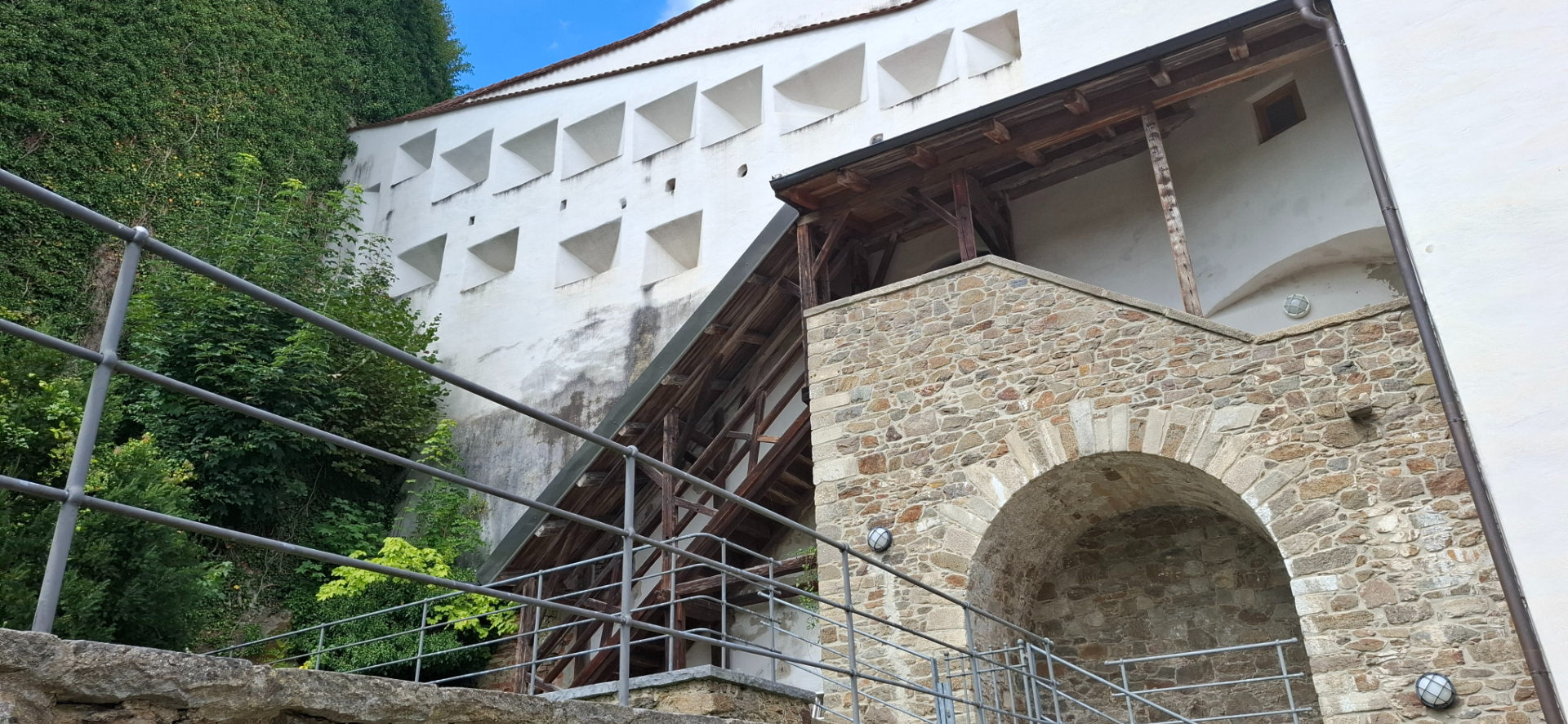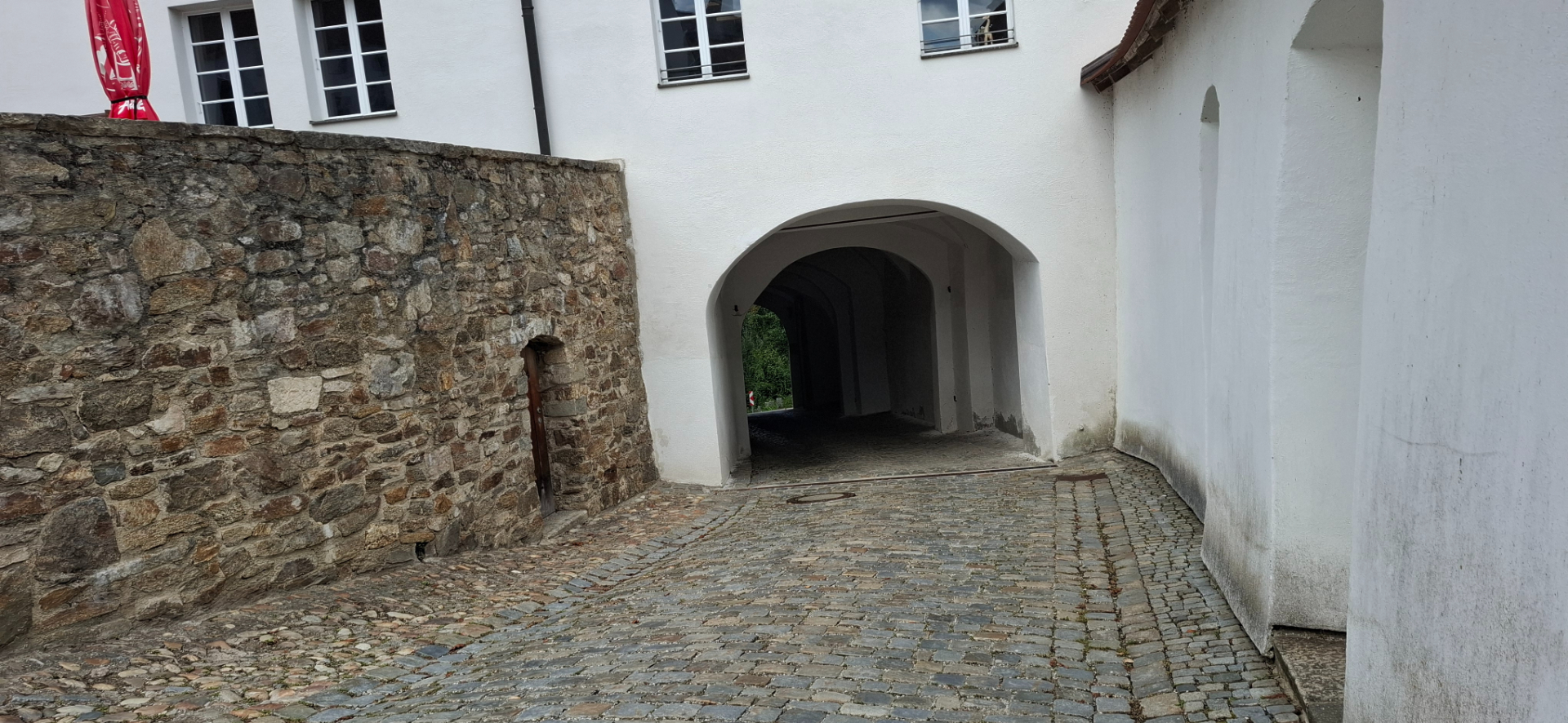Крепость неоднократно перестраивалась и расширялась, и в XVI веке превратилась в укреплённый «княжеский замок», где князья-епископы жили и могли «пересидеть» народные восстания, которые периодически вспыхивали против их неограниченной власти. Потому здесь имелись здания разного предназначения. Здание, построенное Кристофом фон Шахнером в 1499–1503 годах. На фасаде видны герб и дата 1499 даже их города. На верхнем этаже здания находится церемониальный Риттерзал - рыцарский зал на верхнем этаже, он соединен открытой аркадой с дирницем, которые датируются 14–17 веками. Дирниц - отапливаемые палаты в средневековых замках, предназначенные для княжеской свиты. Другие территории спускались кула-то вниз или вверх. По малодушию, не хотела вообще карабкаться опять куда-то наверх, мне и лестницы хватило. Мало я, что ли крепостей, видала? Сначала спустилась к сооружению с арочным проездом в нем. Так была найдена дорога, что по пологой траектории ведет из города в крепость.