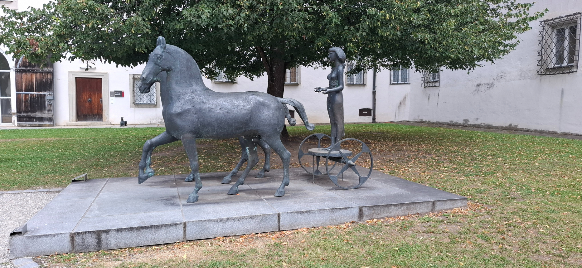 Под деревом металлическая скульптура упряжки из 2-х коней с человеком.