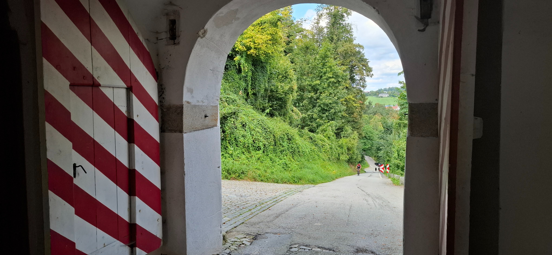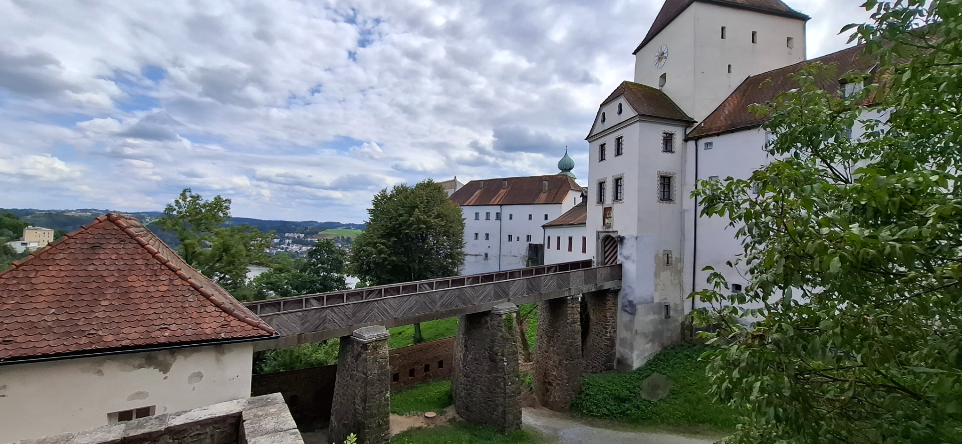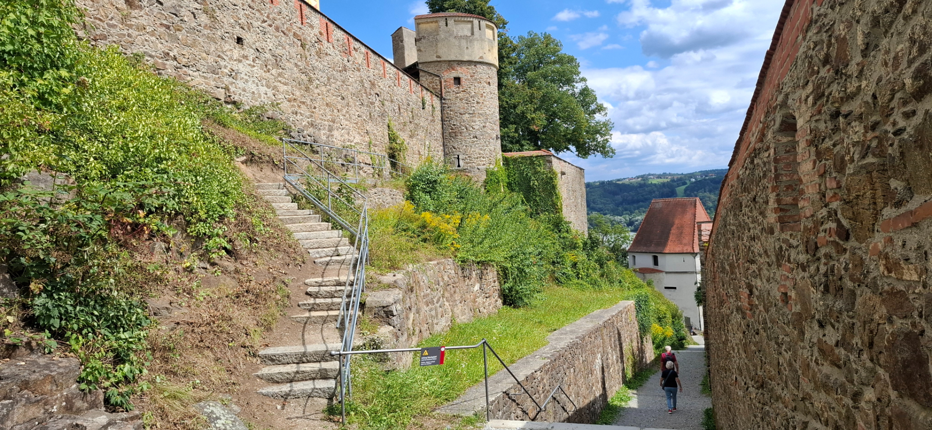 Стараюсь добираться сразу по приезду к самым отдаленным объектам в любом городе, если они запланированы. В Пассау таким являлся замок Veste Oberhaus. Но не получилось от жд вокзала подъехать. Оказалось, что и не нужно пользоваться транспортом - пешком быстрее. Все путеводители указывают путь из Альтштадта по мосту Принц-Леопольд и через дорогу, дальше слева от тоннеля по сотням ступенек наверх. 99,99 процентов туристов так и делают.