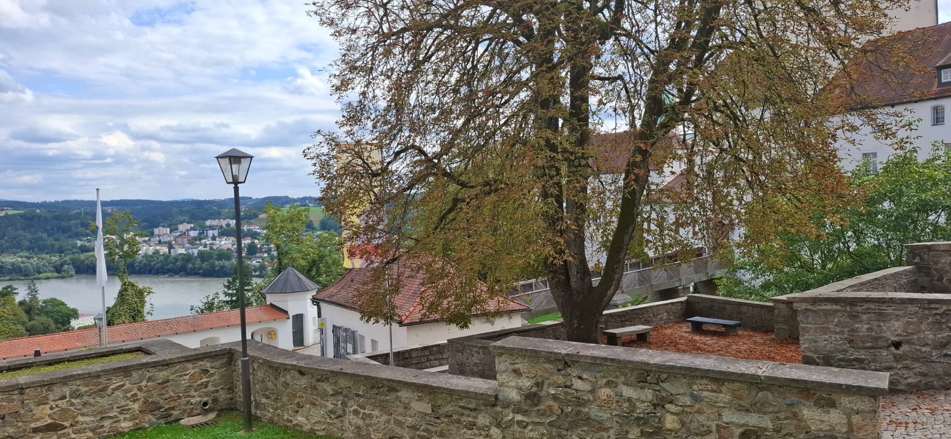 Над рестораном высокая стена, значит, там вверху еще территория есть. На самый верхний уровень - башню «Батарея Линде», не захотела вообще карабкаться. Потом выяснила, что можно на лифте вознестись туда. Я на этом уровне вышла на простор над Дунаем. А могла лишить себя этого феерического вида. С площадки над рестораном открывается панорама во все стороны на город внизу. На переднем плане, конечно, Дунай. Позади кварталов Альтштадта - Инн.