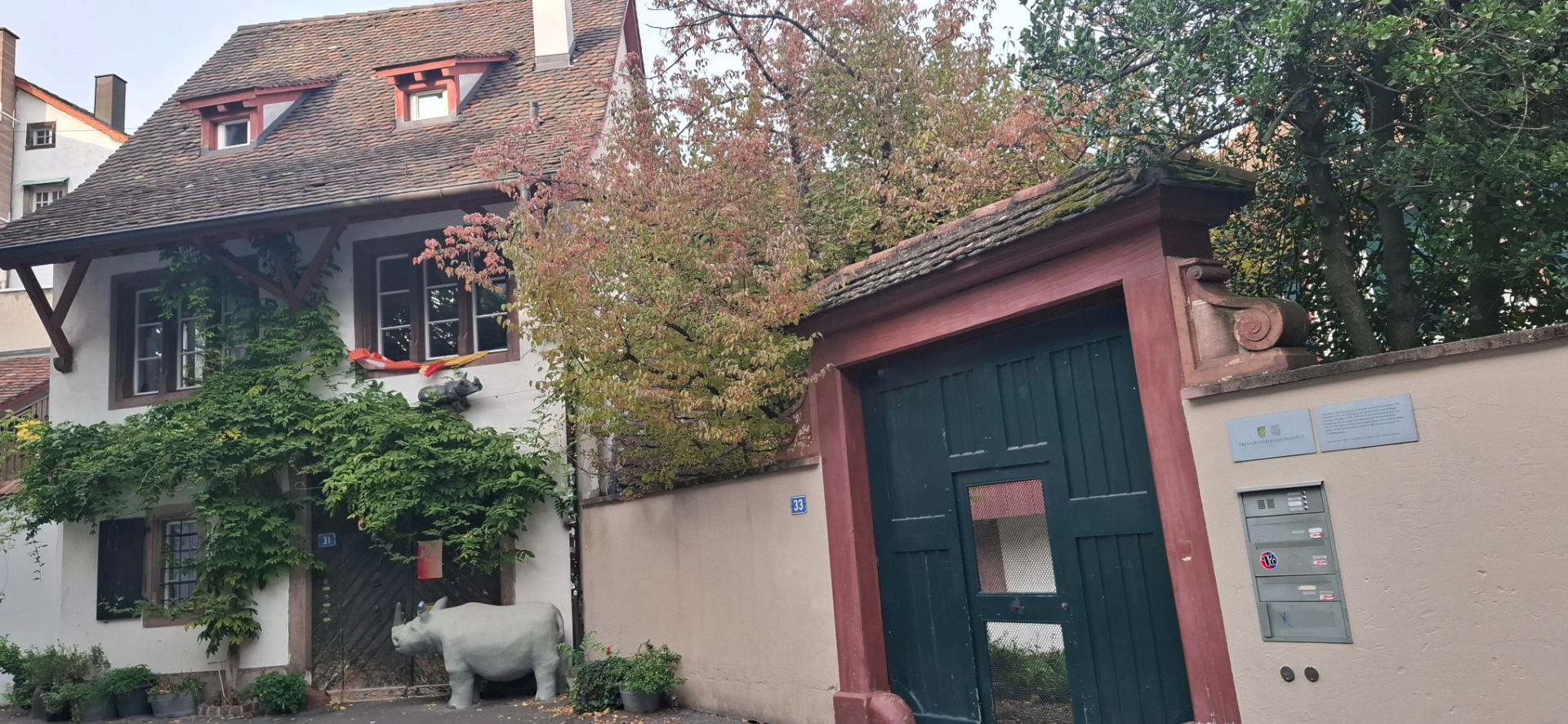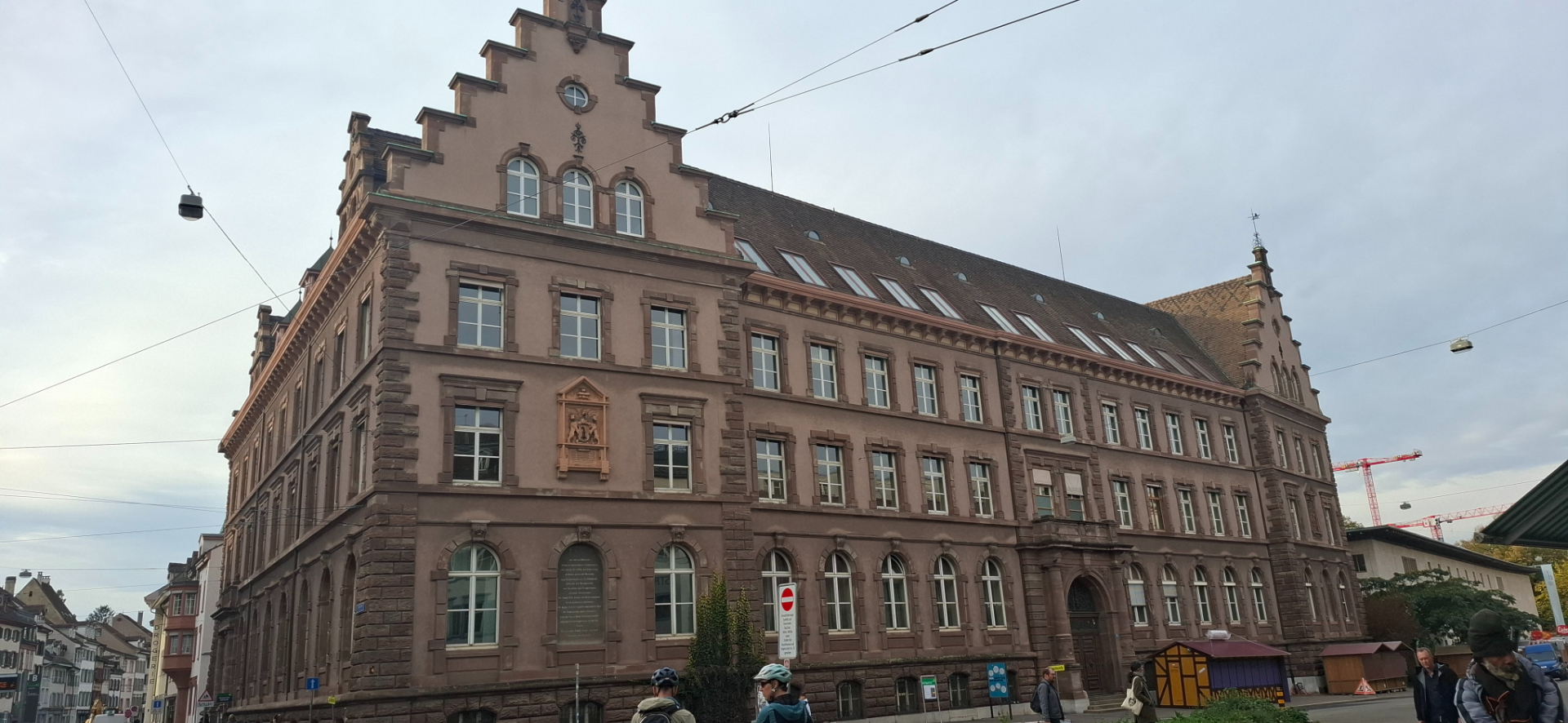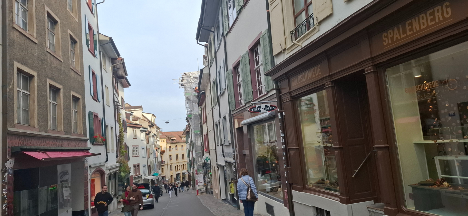 Крутая дорога с трамвайными путями под зданием уходит вниз к невидимой отсюда Марктплац. Это исторический путь, который идёт поперёк холма. Он был одной из ключевых коммуникаций средневекового Базеля. По ней из предместий шли торговцы, ремесленники и жители холмов к основным городским рынкам.