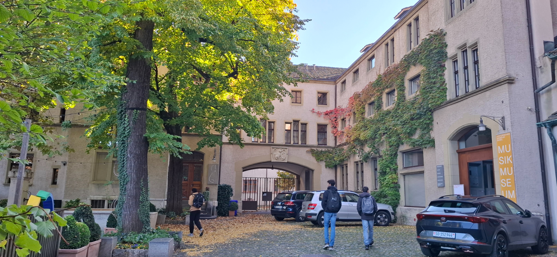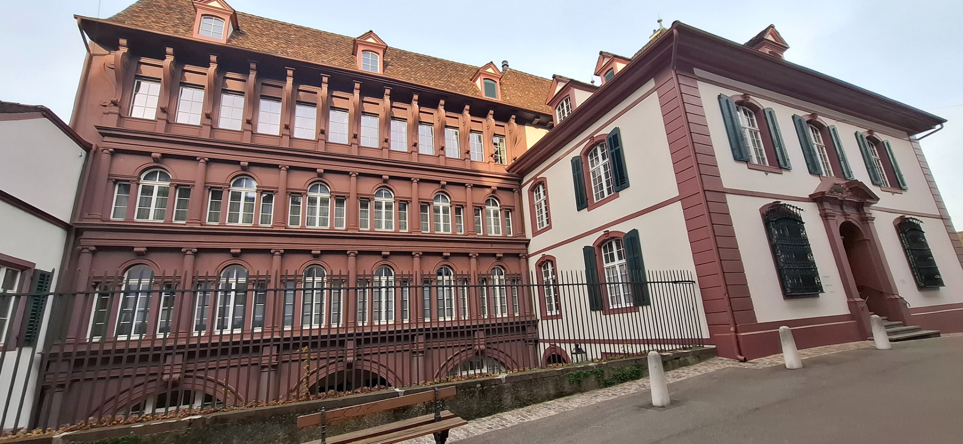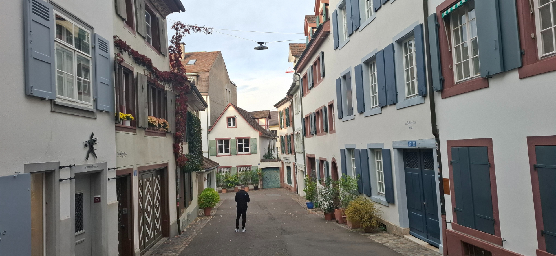 Крутая дорога с трамвайными путями под зданием уходит вниз к невидимой отсюда Марктплац. Это исторический путь, который идёт поперёк холма. Он был одной из ключевых коммуникаций средневекового Базеля. По ней из предместий шли торговцы, ремесленники и жители холмов к основным городским рынкам.