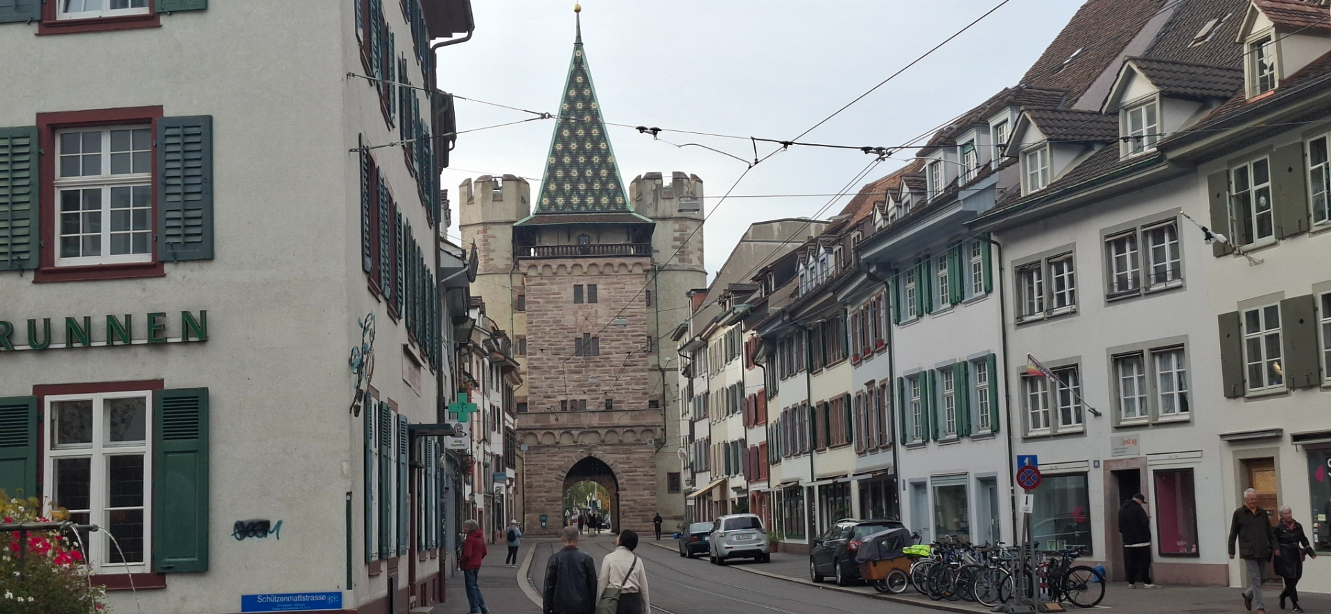 В историческом центре Базеля взобрались на холм от площади Барфюссерплатц и потом вернулись на нее обратно. На двух холмах справа, слева над этой площадью находятся самые старые закуточки города. Но описание этой части прогулок по Базелю начну с ворот Spalentor, что стоят в конце этой части «старого города».