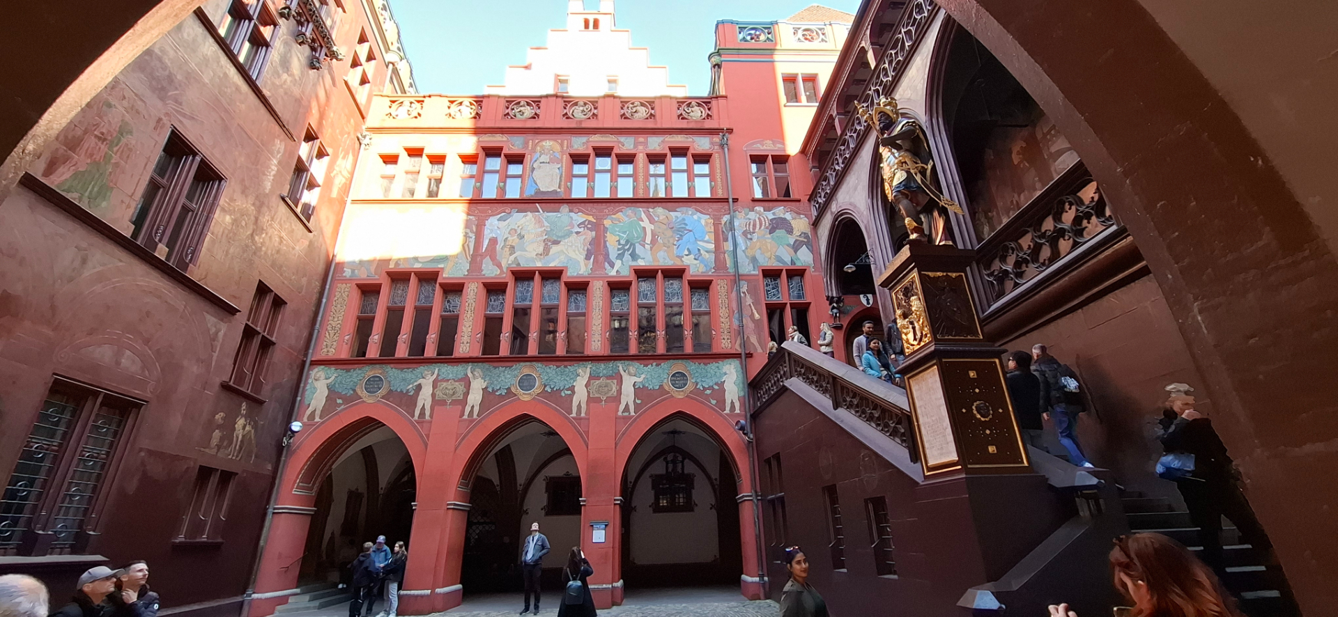 Богатая отделка фасада с эркерами, цветная узорная черепица на крыше, позолоченные башенки – просто сказочный домик для чиновников построили. На фасаде копии древних скульптур, повторенные в 1901 году. Первоначальные были изготовлены в начале 16 века. Одна из скульптур - император Римской Империи Генрих Первый, рядом - его супруга Кунигунда. Женщина была выдающаяся, настолько умна в делах государства, что император не развелся с ней, несмотря на отсутствие детей. И настолько благочестивая, что когда ее обвинили в супружеской неверности, смогла доказать свою невиновность, пройдя по горячим углям босиком. Сейчас в ратуше расположены органы законодательной и исполнительной власти кантона Базель-Штадт, а также мэрия города. Вход во внутренний дворик свободный.