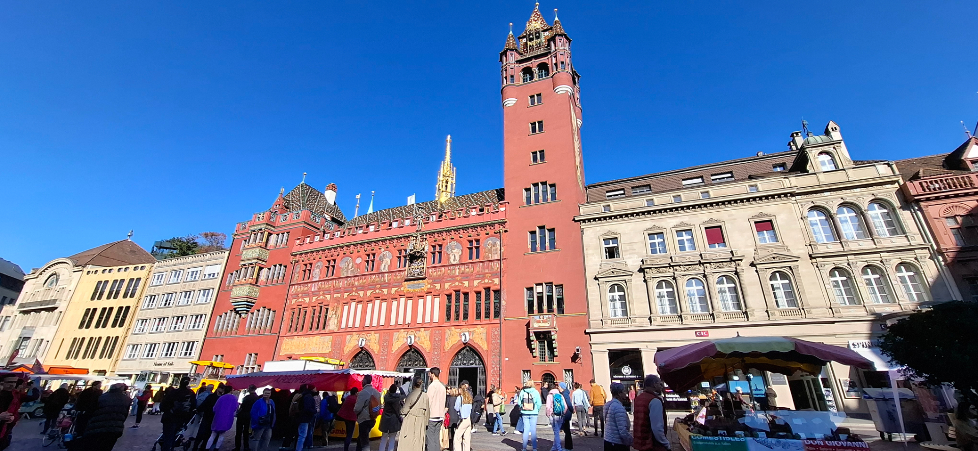 Самое выдающееся строение на площади - Красная ратуша. Здание в своем сегодняшнем виде было построено, когда Базель присоединился к Швейцарской Конфедерации в 1501 году, в 17 было достроено, а в 19 к нему пристроили башню. Что интересно, а давние времена ратуша не вызывала такого интереса, как сейчас - каждый турист должен найти и сфотографироваться на ее фоне. До 1900 года изображений ратуши почти не встречается. Когда ее построили в начале XVI века, постройка была приурочена к вступлению города в Швейцарскую Конфедерацию, причем место для неё было городскими гильдиями выбрано демонстративно в отдалении от тогдашнего центра города - собора, прямо на рыночной площади. Четыреста лет здание простояло, не привлекая особого внимания, пока власти не затеяли реконструкции площади. В рамках реконструкции к ратуше в 1901 году были пристроены Новый флигель (слева) и краснокирпичная башня (справа). Популярность её сразу выросла.