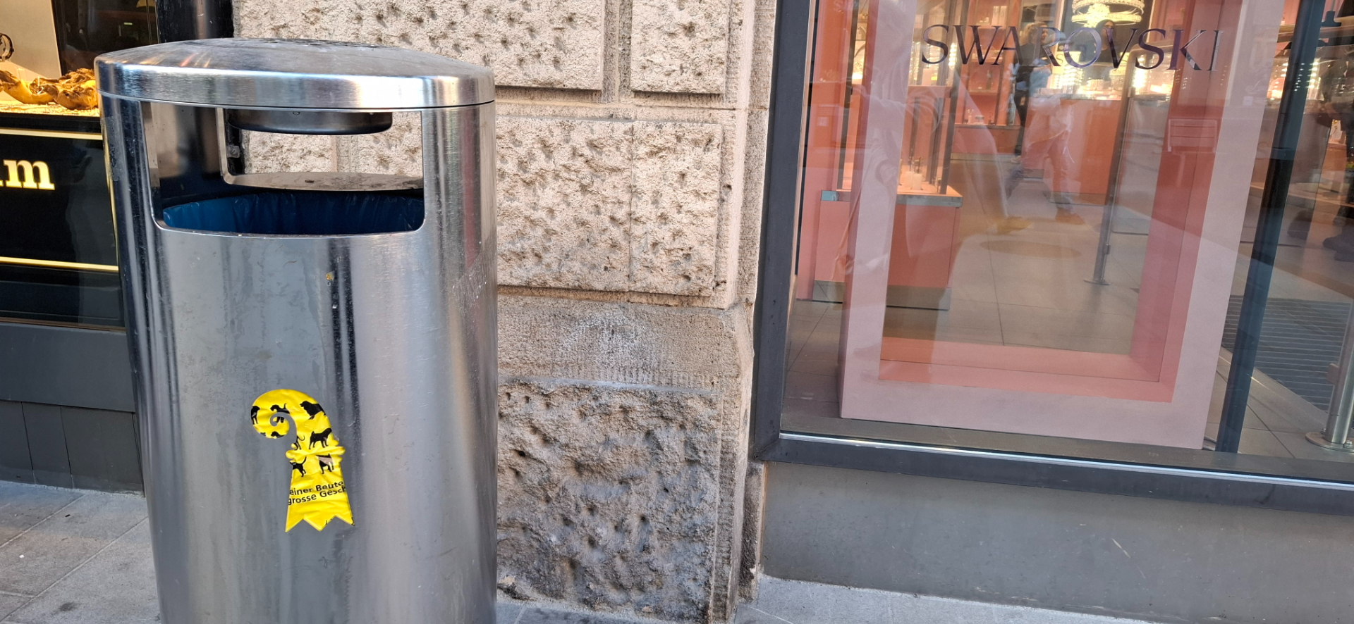 Удивительно было выяснить, что изображение, который встречается на каждом шагу, особенно часто на мусорных баках, это епископский посох и герб города. Герб постоянно присутствует в виде вывески рядом с названием ресторана, то просто украшением на какой-то поверхности. В зависимости от цвета: красного или черного, можно по нему определить, находимся в городской черте или сельском пригороде Базеля.