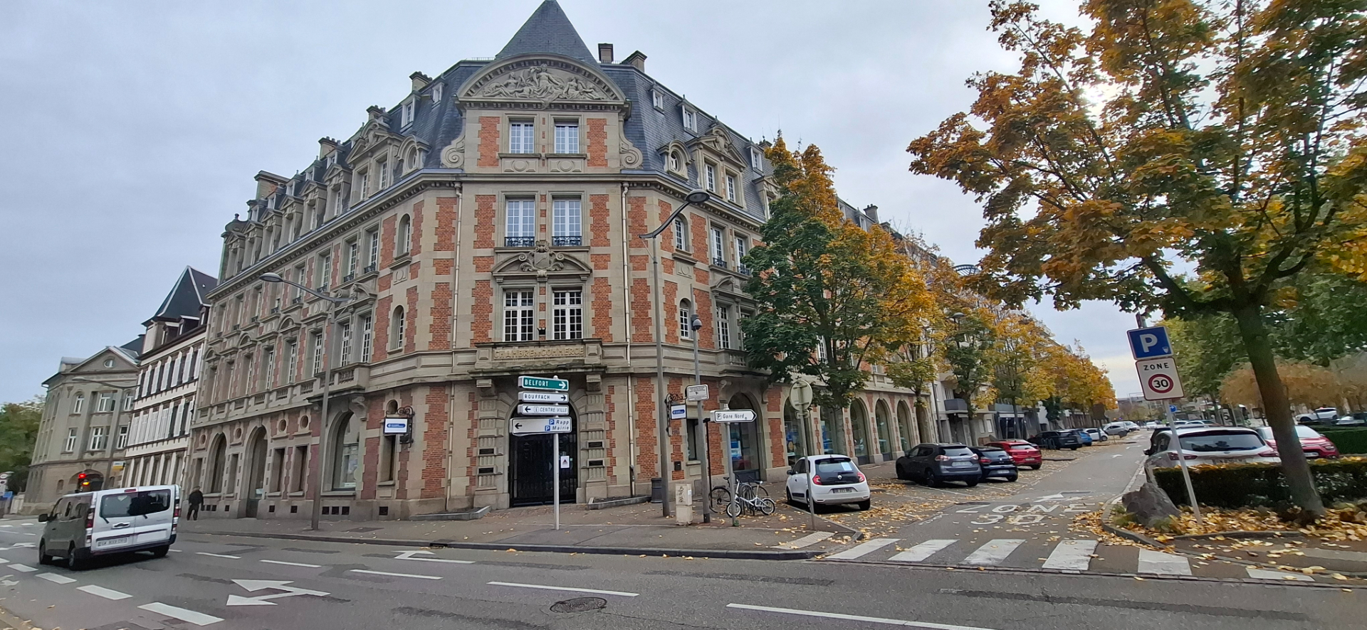 После парка идут кварталы с более современными домами, чем в историческом центре. Угловое здание на важной городской оси - Торгово-промышленная палата Кольмара. Над центральным входом видна надпись «CHAMBRE DE COMMERCE».