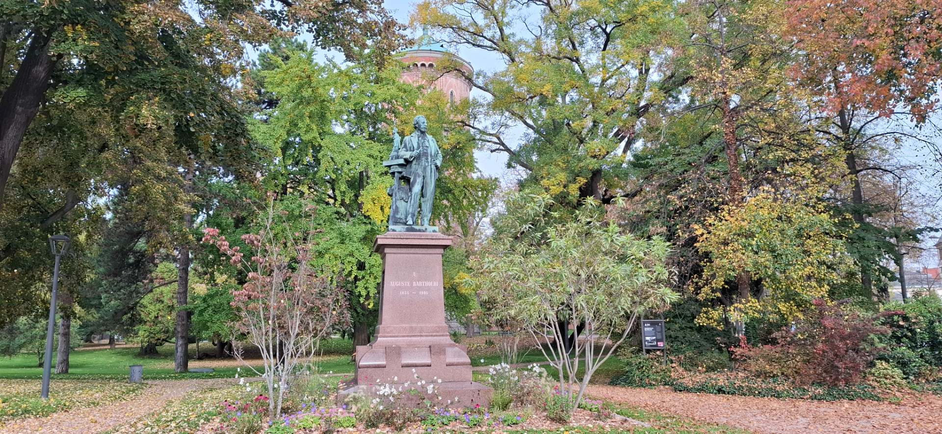 Рядом с водонапорной башней в стороне от туристических троп города стоит памятник Фредерику Огюсту Бартольди, автора Статуи Свободы и Льва Бельфорта. В походе по историческому центру было встречено много еще связанного с этим известным уроженцем Кольмара.