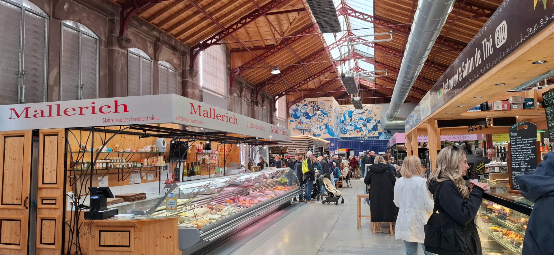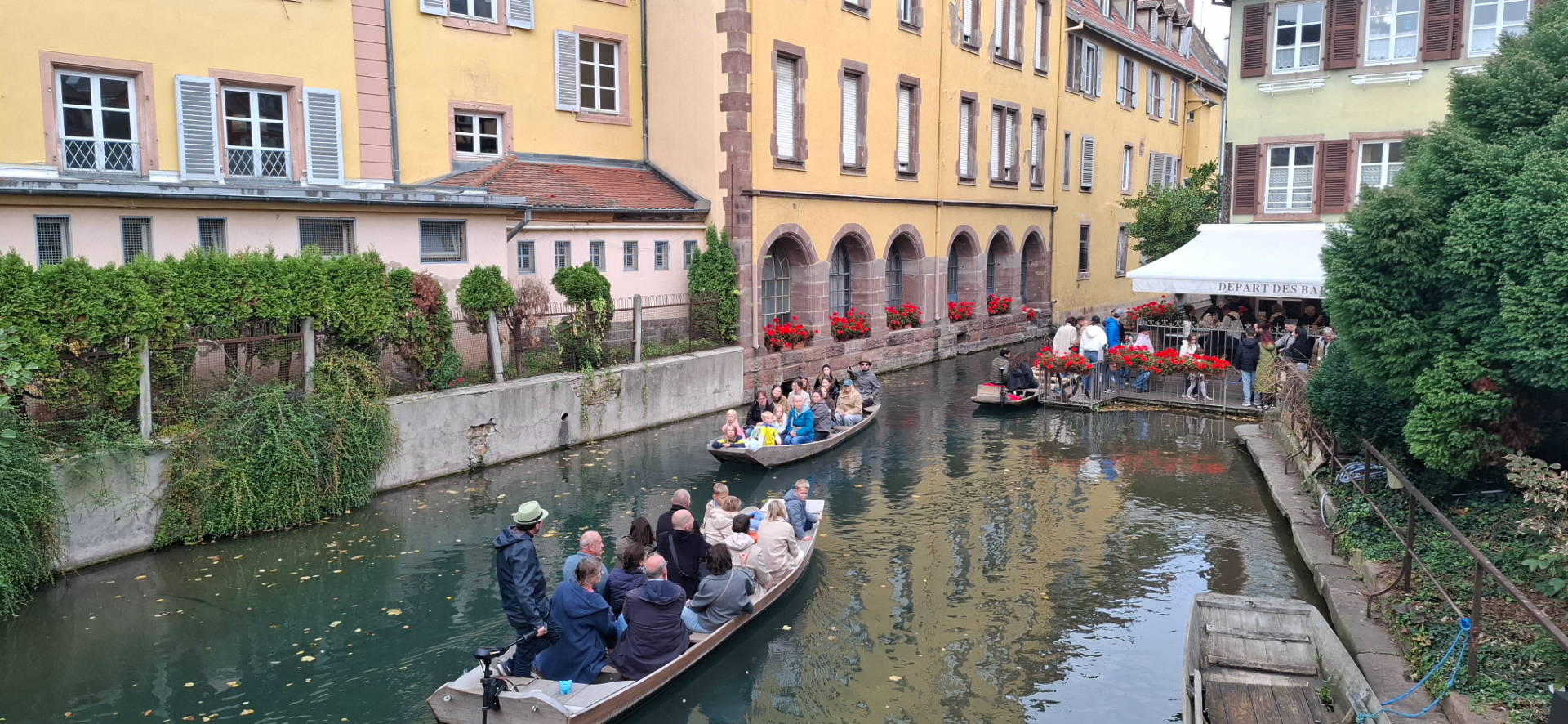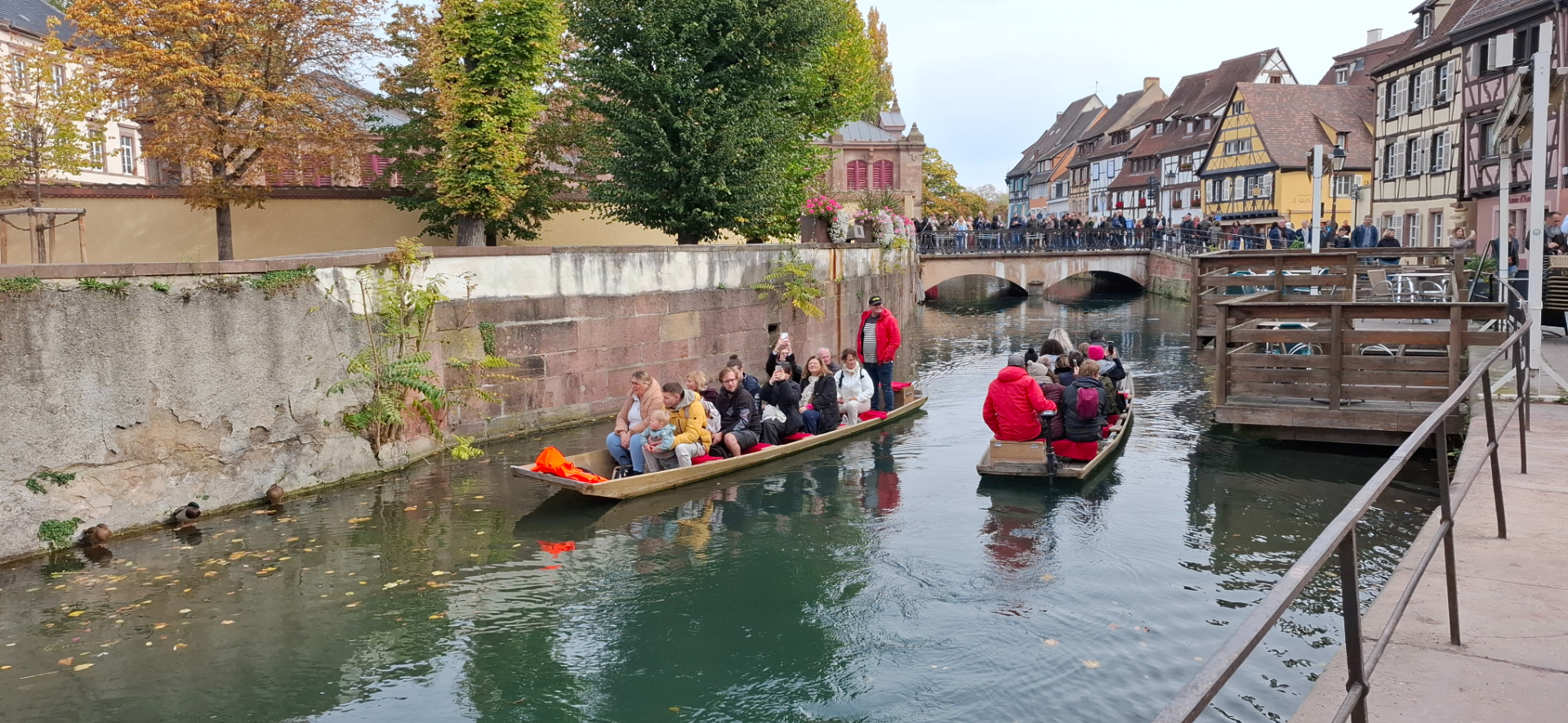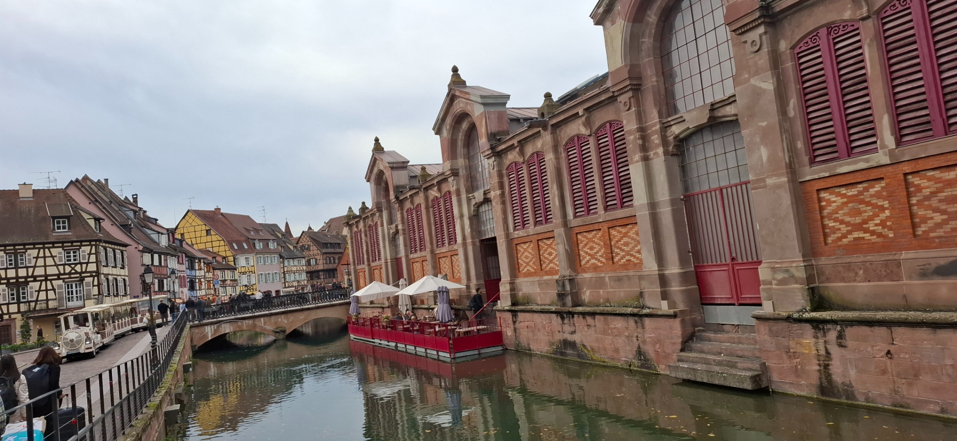 Над каналом задолго до подхода, виден Рынок- Marché couvert. Рыба была основным товаром рынка и магазинов, расположенных по берегам речки Лош. Правый берег до сих пор называется Рыбной набережной. В нише на углу рынка есть статуя Маленького виноградаря (Le petit vigneron) работы Бартольди, потом в городке много еще творений Бартольди можно встретить. Рынок построен в 1965 году, был символ модернизации торговли в Колмаре. Торговцы могли разгружать продукцию прямо с барок, плоскодонных лодок от реки Lauch. В первой половине XX века, особенно после Второй мировой войны, здание постепенно пришло в запустение, использовалось под различные складские и хозяйственные нужды. В интернете говорится, что здание «возвратилось к своей первоначальной функции как торговой залы» в сентябре 2010 года. А лодочники на реке Lauch по-прежнему привозят свои «барки» к Рынку, только теперь с туристами😊, как когда-то подвозили овощи к рынку.