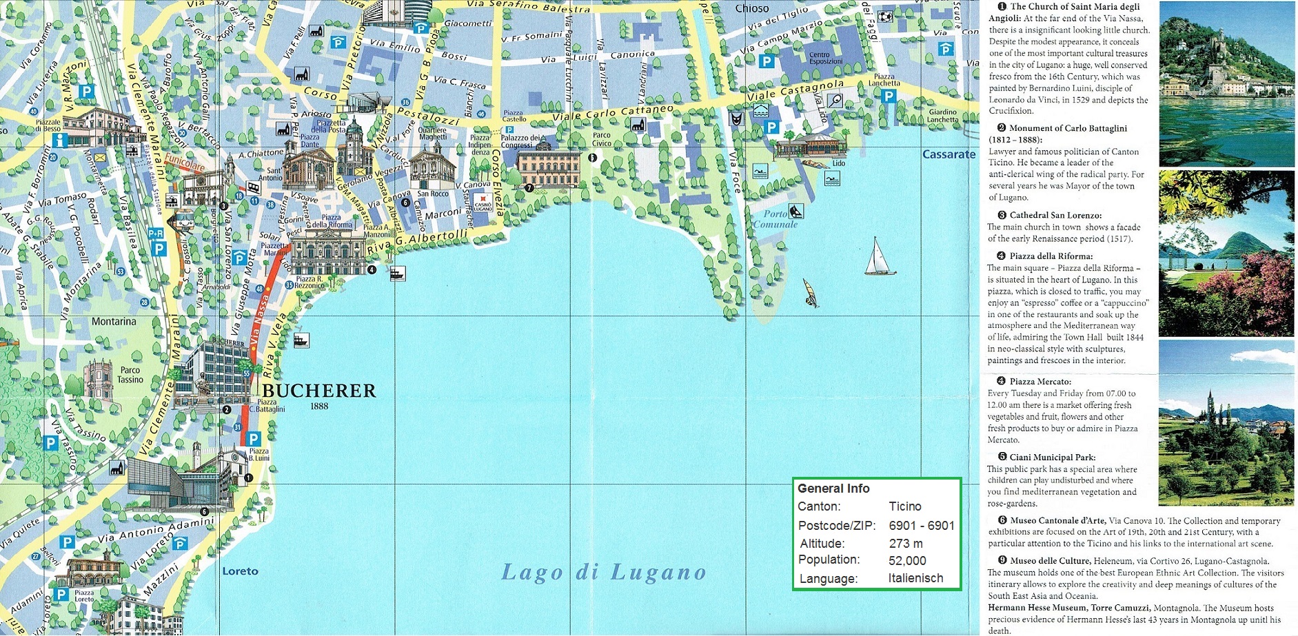 Туристическая карта Лугано - карта, на которой представлены памятники архитектуры страны, места отдыха, музеи, театры, кафе и рестораны.
