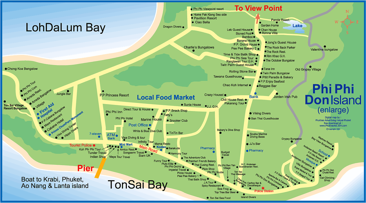 Туристическая карта Пхи-Пхи - карта, на которой представлены памятники архитектуры страны, места отдыха, музеи, театры, кафе и рестораны.