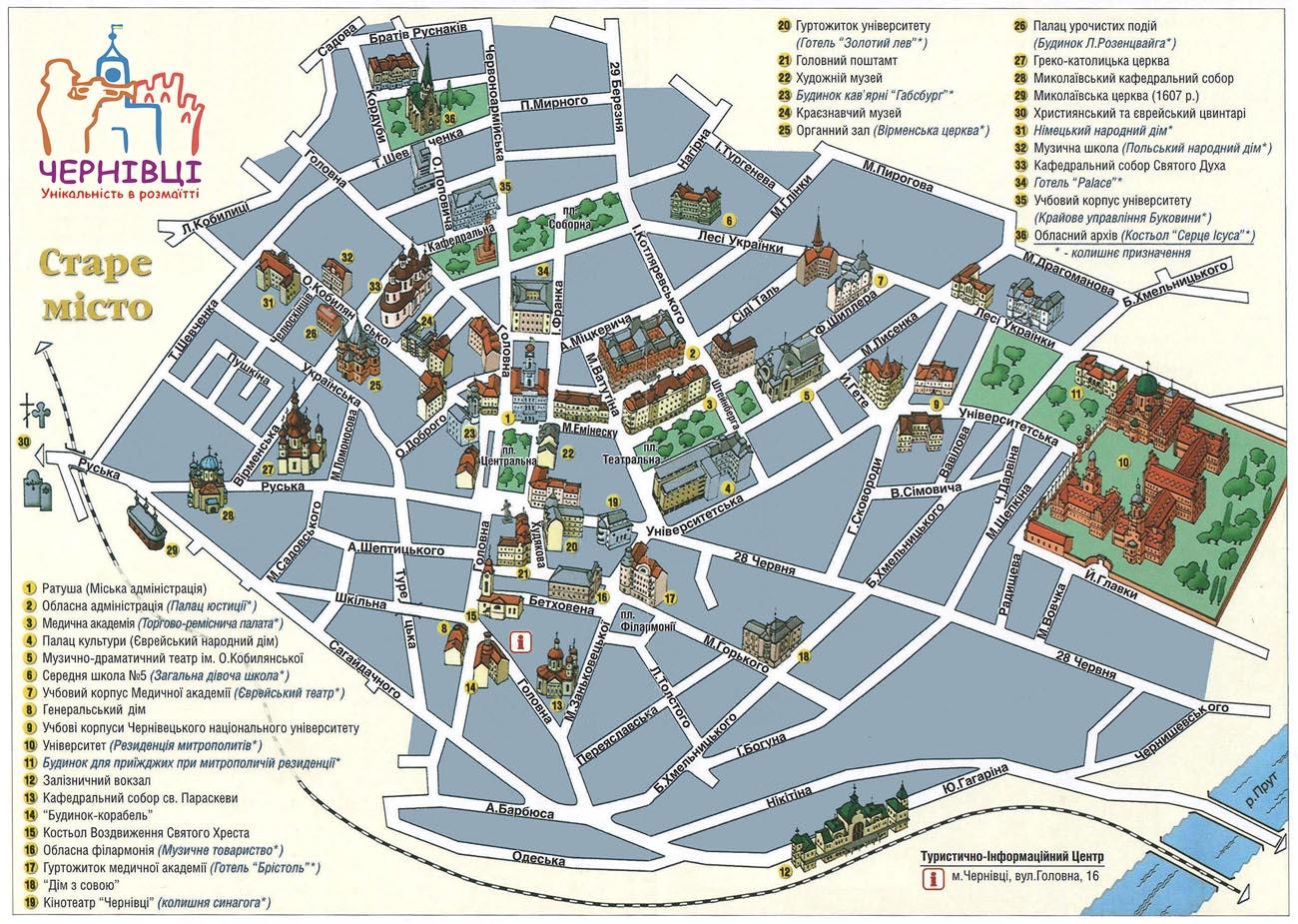 Туристическая карта Черновцов - карта, на которой представлены памятники архитектуры страны, места отдыха, музеи, театры, кафе и рестораны.