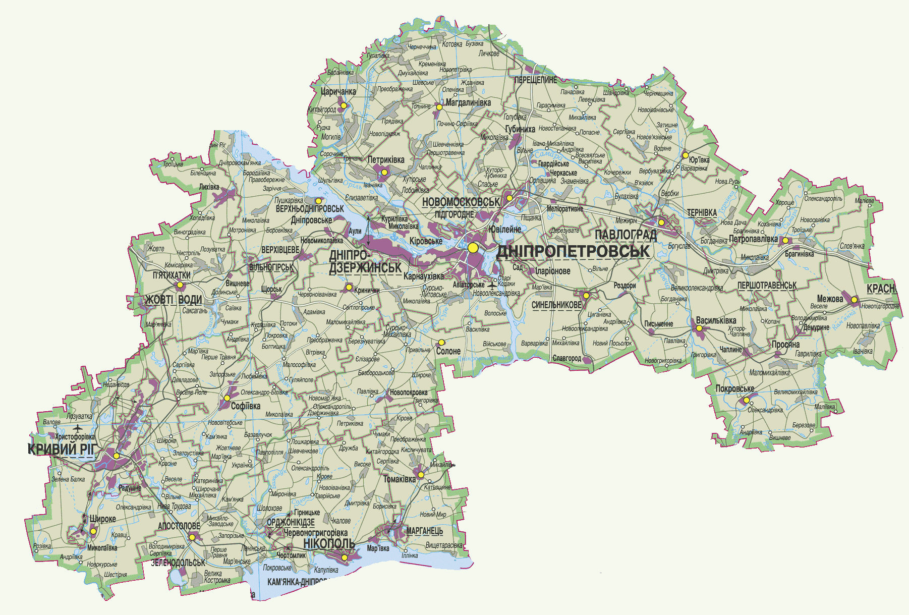 Подробная карта Днепропетровской области - карта, на которой подробно изображена местность. Подробная карта содержит сведения о рельефе, городах, населенных пунктах, дорогах, коммуникациях и других объектах местности.