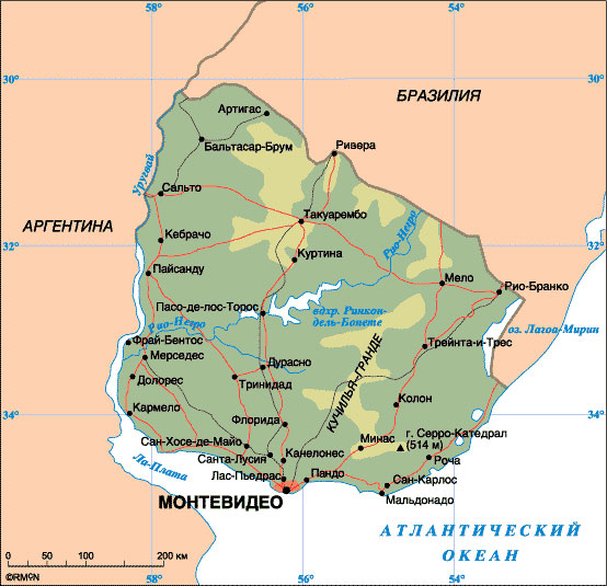 Физическая карта Уругвая - карта, на которой отображаются особенности рельефа местности, растительность, природные объекты, регионы и города, транспортные пути.