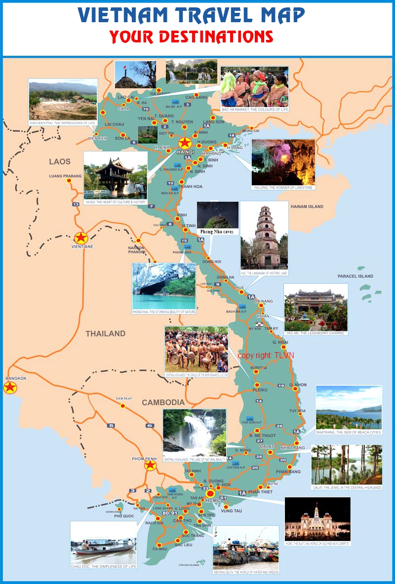 Туристическая карта Вьетнама - карта, на которой представлены памятники архитектуры страны, места отдыха, музеи, театры, кафе и рестораны.
